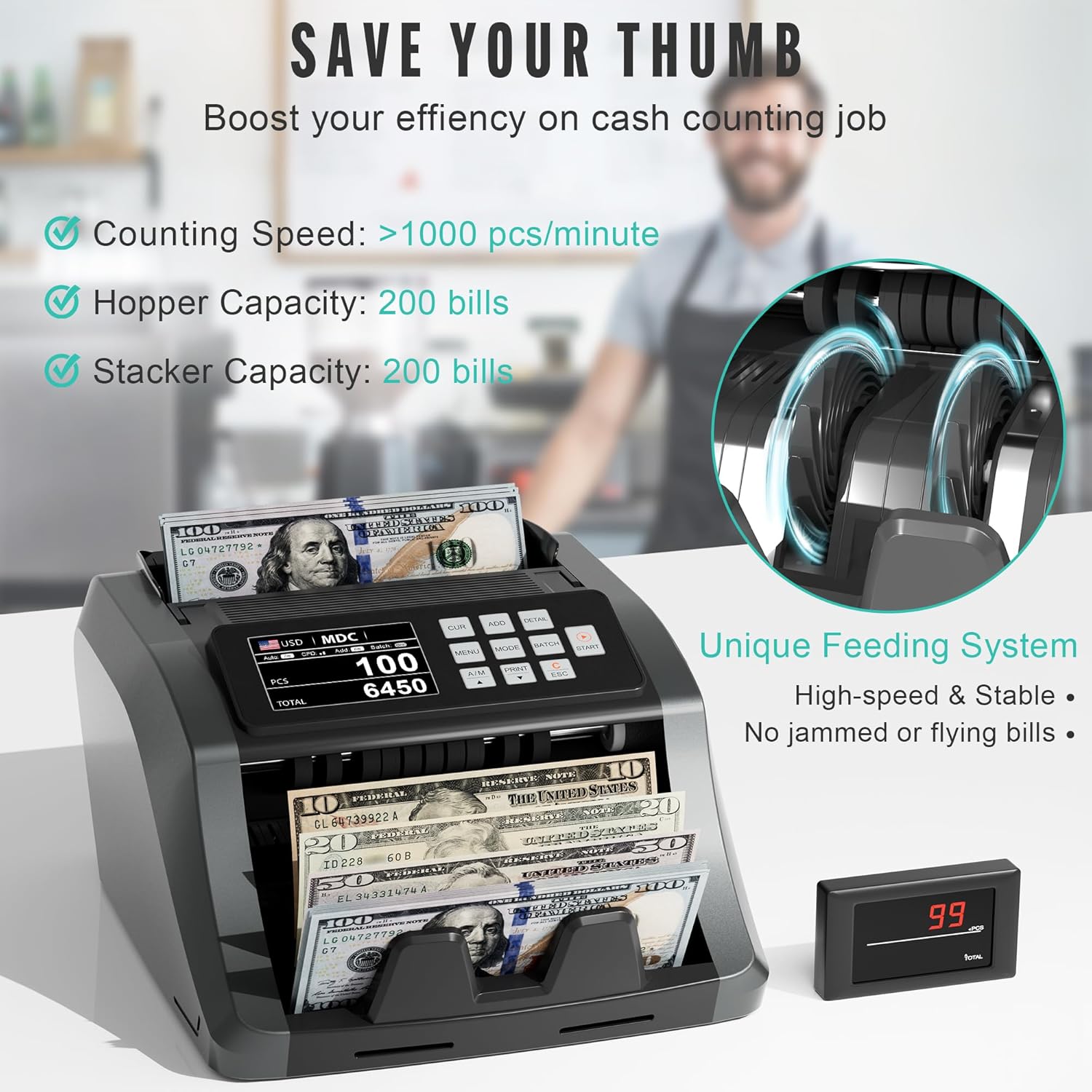 - 【EFFICIENT AND ACCURATE】The mixed denomination bill counter can count more than 1200 bills/min smoothly, fast, and accurately with low noise. The large hopper capacity can hold 200 bills, meeting the maximum demand of various occasions.