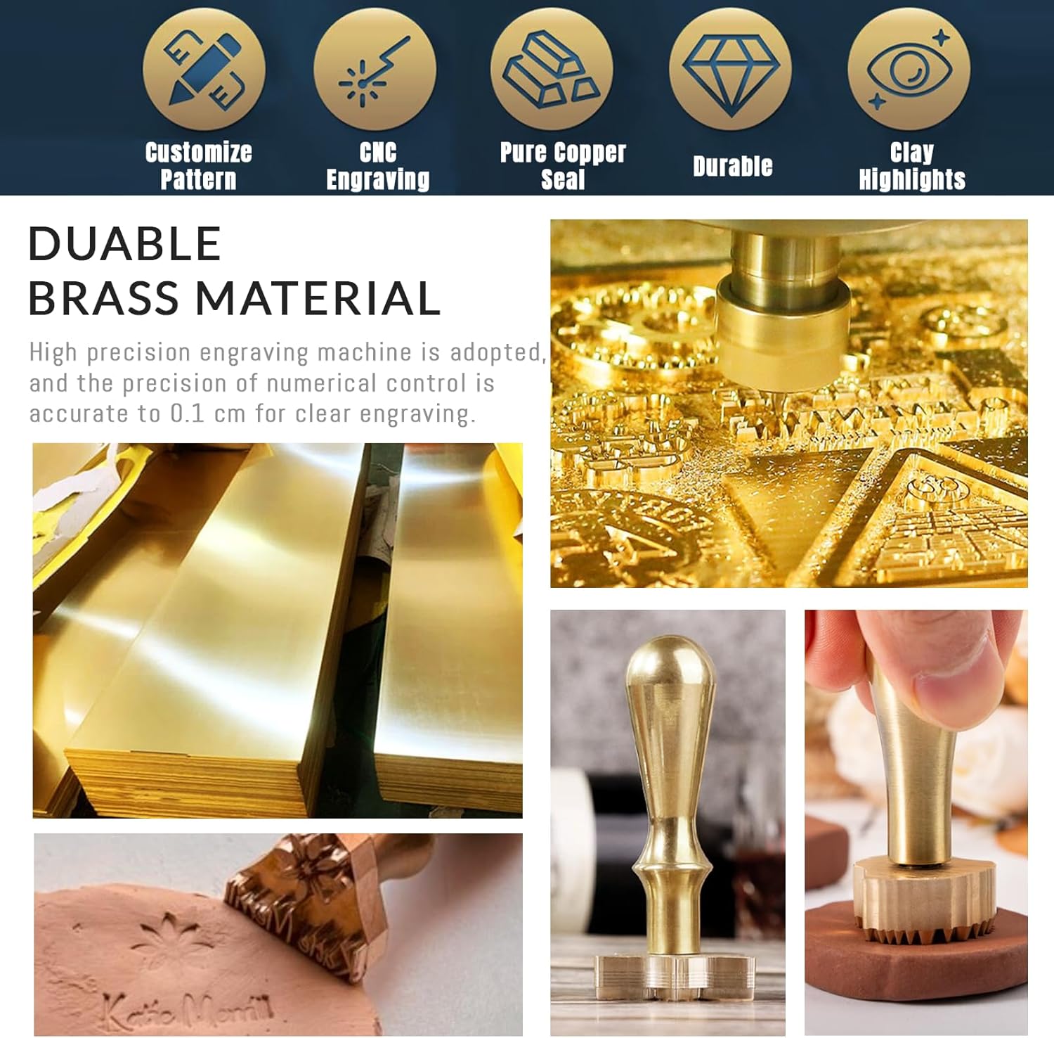 - 🟡 Detachable Brass Head: Our high-quality personalized clay pottery stamp features a detachable brass stamp head and a copper handle. Crafted from durable brass, it resists rusting, fading, and maintains a smooth and glossy finish. The stamp creates clear and detailed impressions, is easy to clean, and can be reused multiple times. The comfortable grip handle offers two processing options: raised letters on the pottery or recessed letters within the pottery.