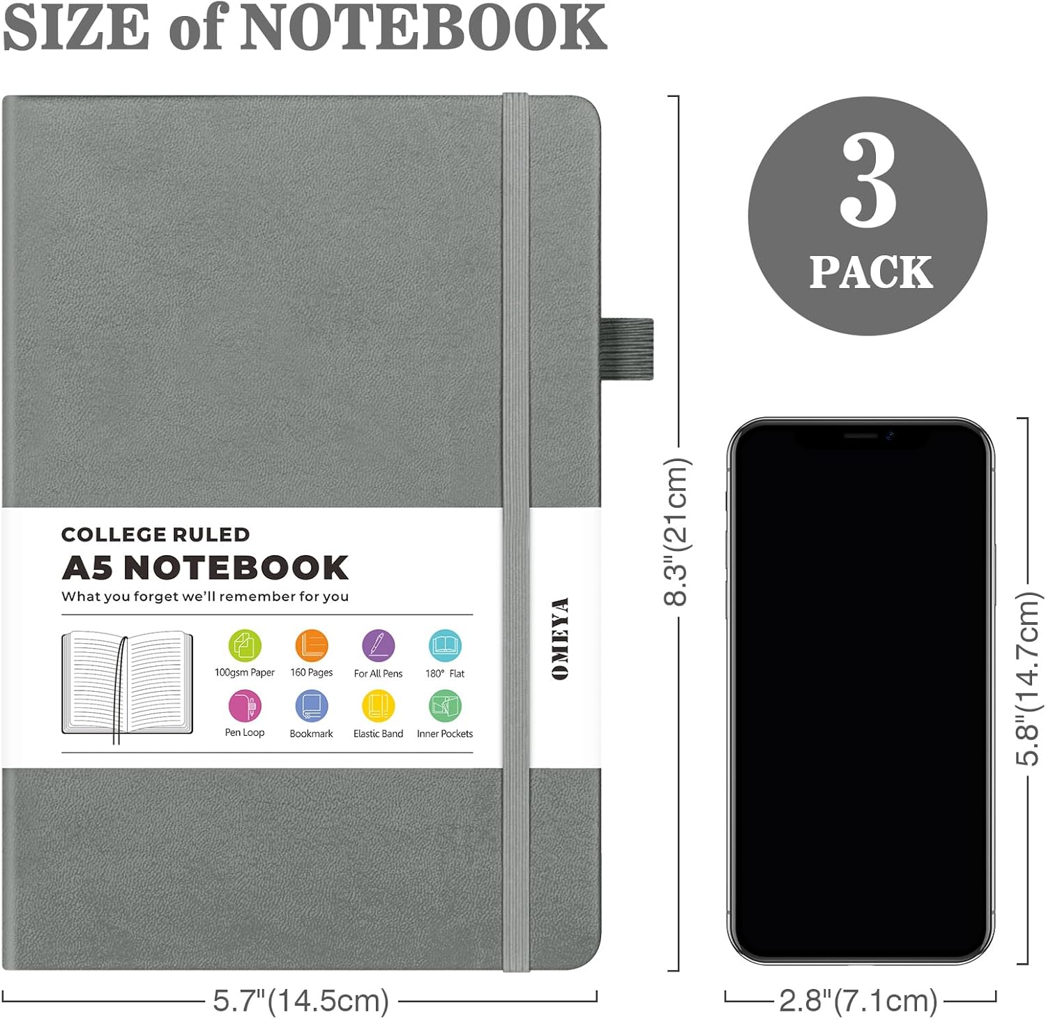 OMEYA Lined Journal Notebook, 3 Pack A5 College Ruled Notebooks for Work, Hardcover Notebook Each with 2 Pockets & Pen, Leather Journal for Women, Men, 160 Pages, 100GSM Thick Paper (Grey)