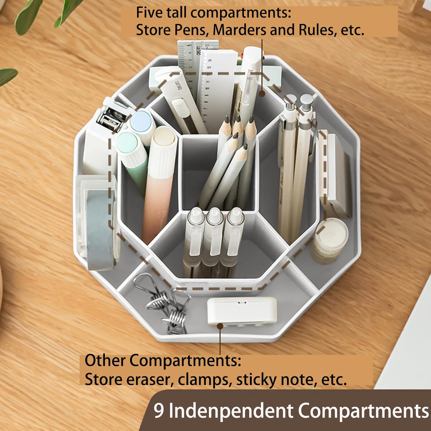 - ă9 Independent Compartments DesignăThis pencil organizer has 9 divided compartments with different spaces and heights to meet your needs, makes it easy to hold and sort pencils, pens, rulers, scissors, pencil knife, etc. Save your time searching for different pens.