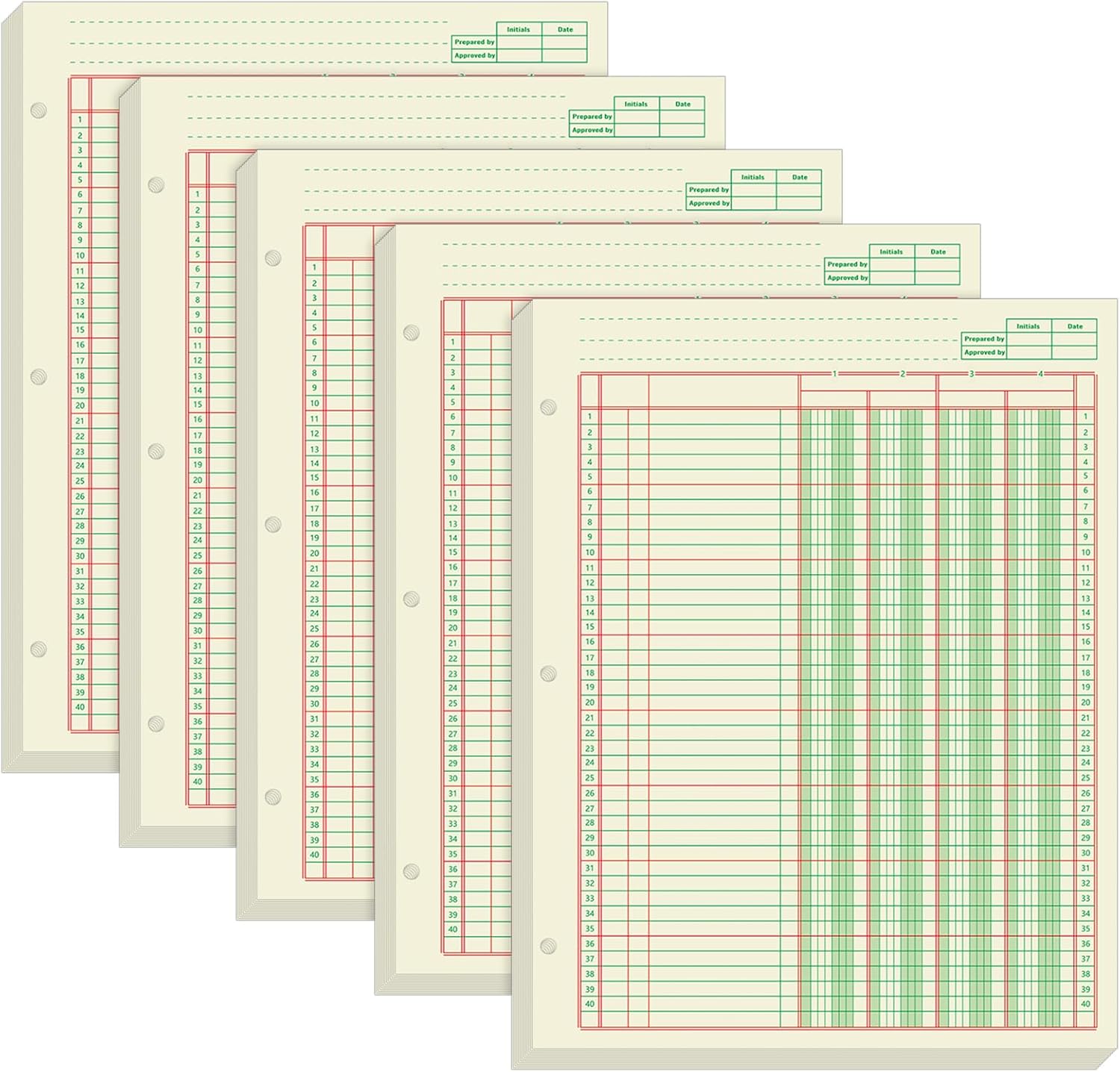 Fulmoon 5 Pack 250 Sheets Ledger Paper Accounting Columnar Pads 3 Hole Analysis Accounting Ledger Book for Business, 50 Sheets/Pack, Single Page Format, Green(8.5 x 11 Inch,4 Columnar)