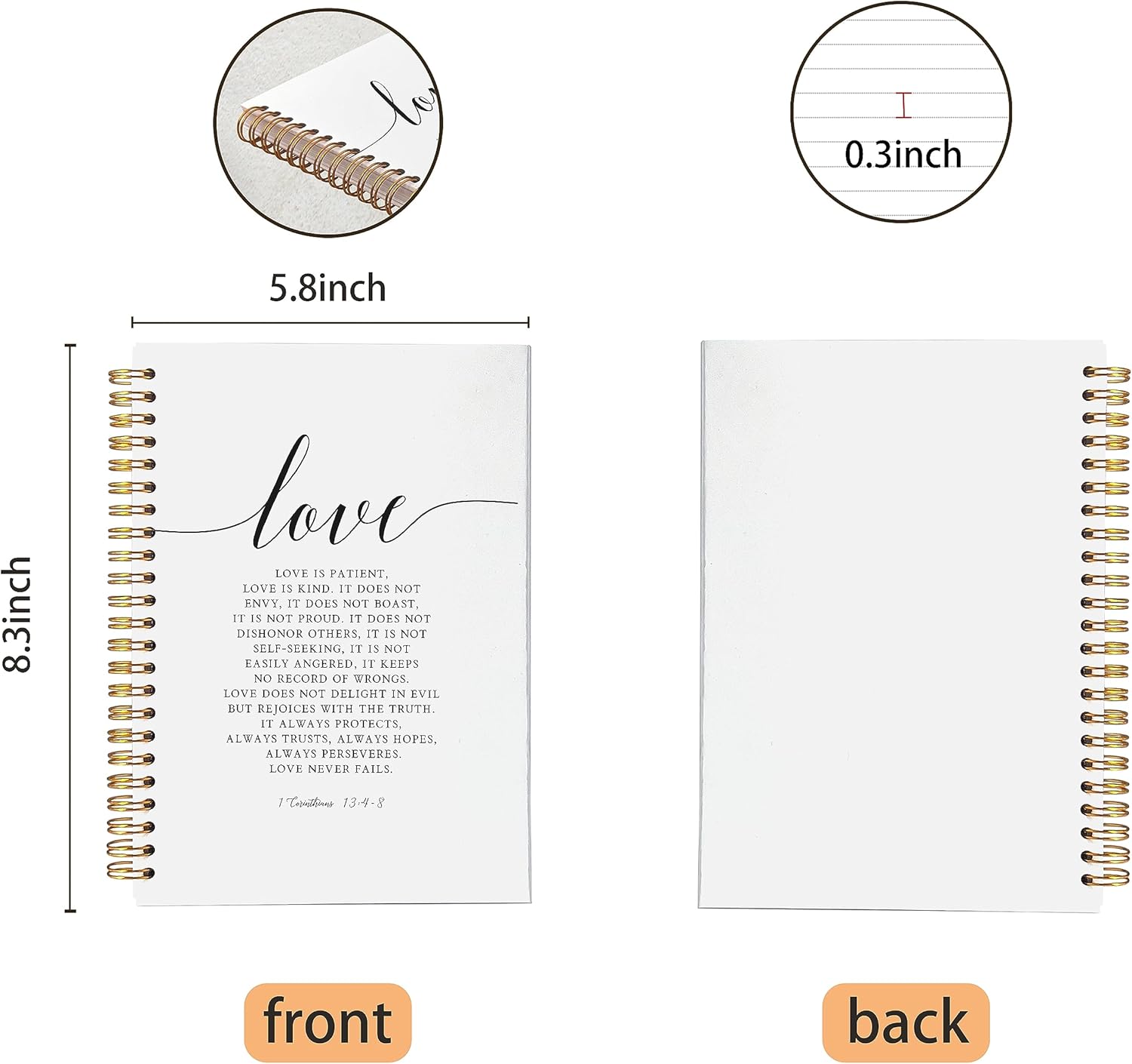 VNWEK Christian Notebook,Bible Journaling Notebook,Bible Journal,Church Notes Notebook,1 Corinthians 13:4-8 Love Never Fails Spiral Notebook Journal 5.5x8.3 Inch,Christian Journals for Women