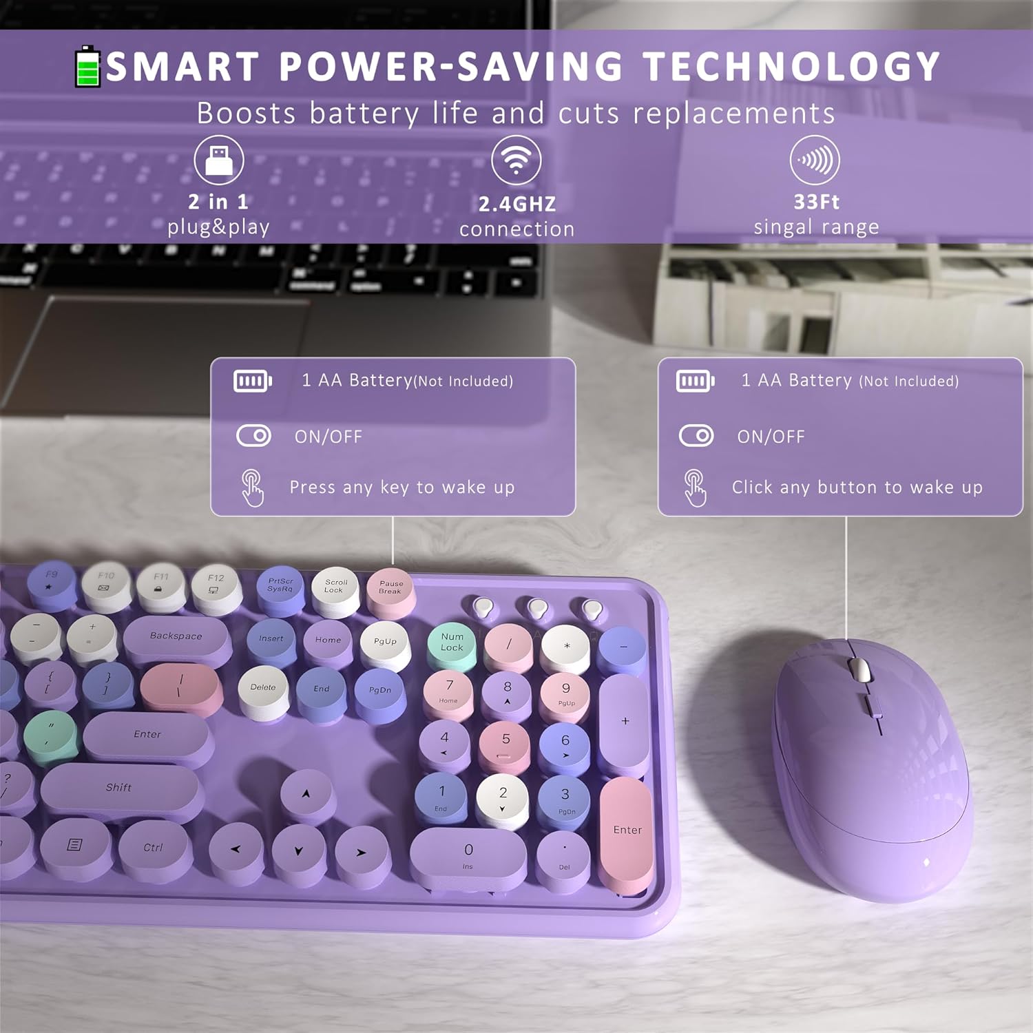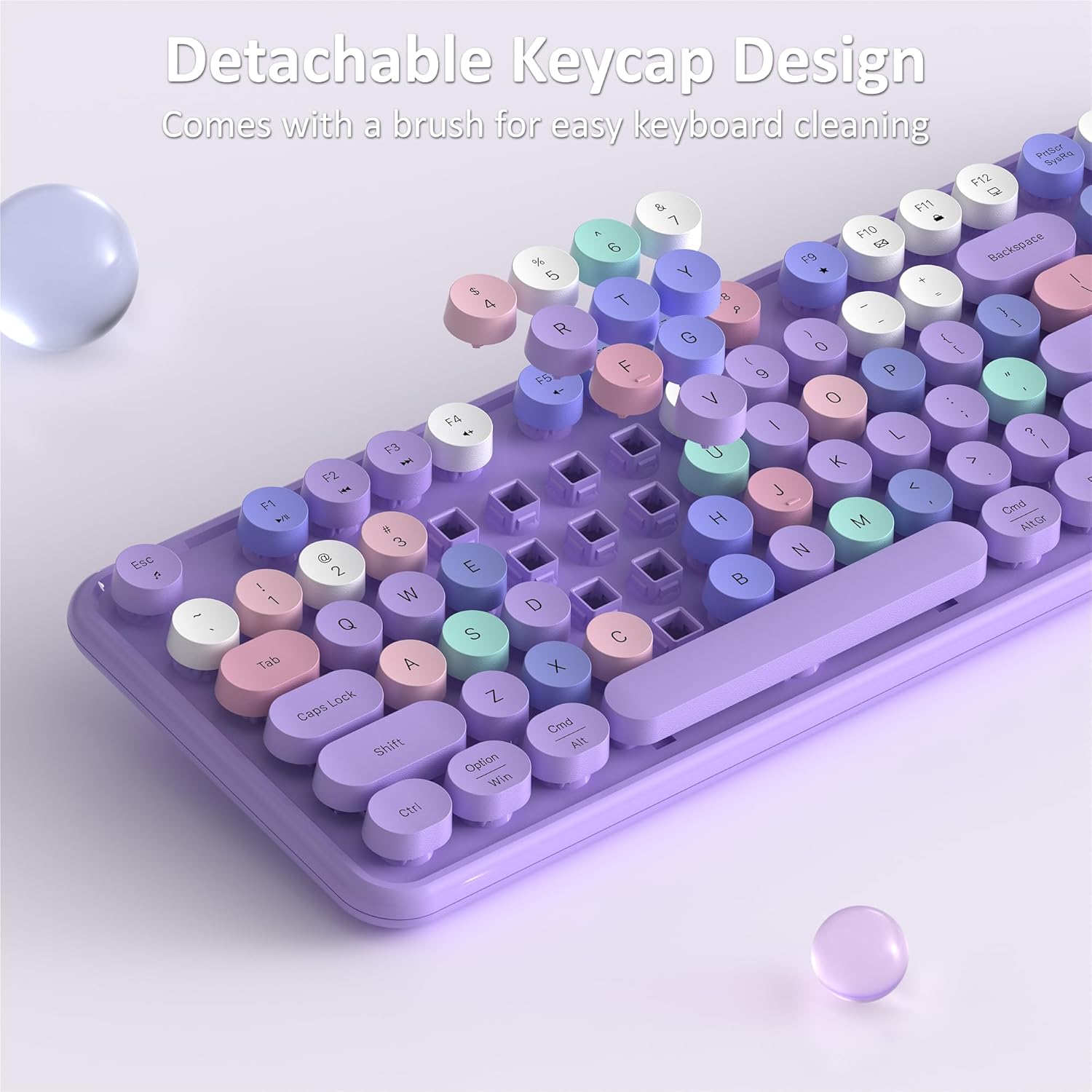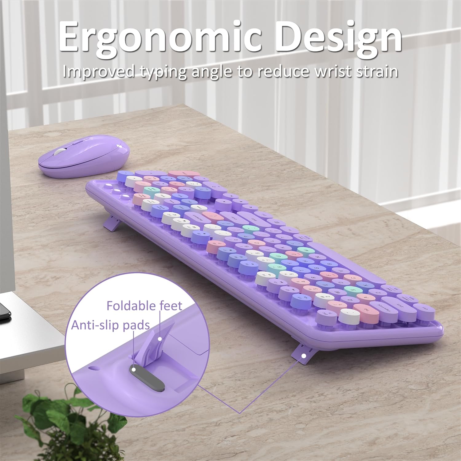 Wireless Keyboard and Mouse, Full-Size Retro Typewriter Keyboard with Round Keycaps, 2.4GHz for Windows, Mac, Laptop, PC, Desktop (Purple Colorful)