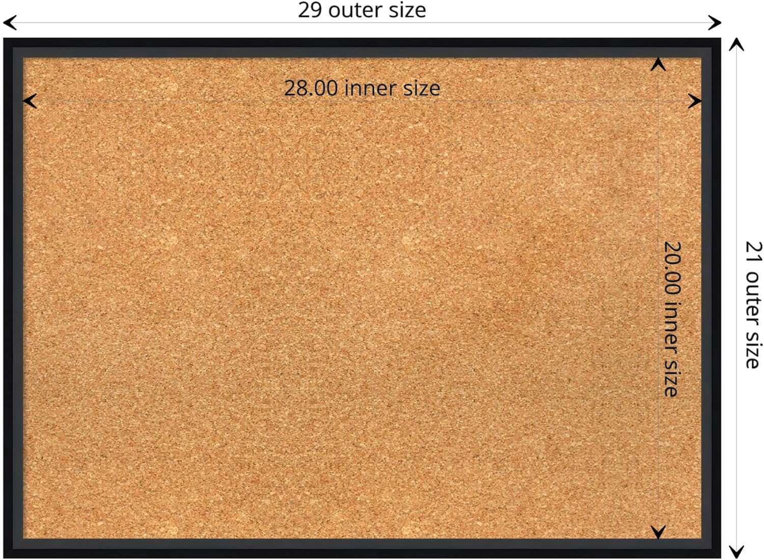 - DIMENSIONS: The overall size of this framed corkboard measures 29 in. x 21 in., including the frame. Its functional cork board area measures 28 in. x 20 in.