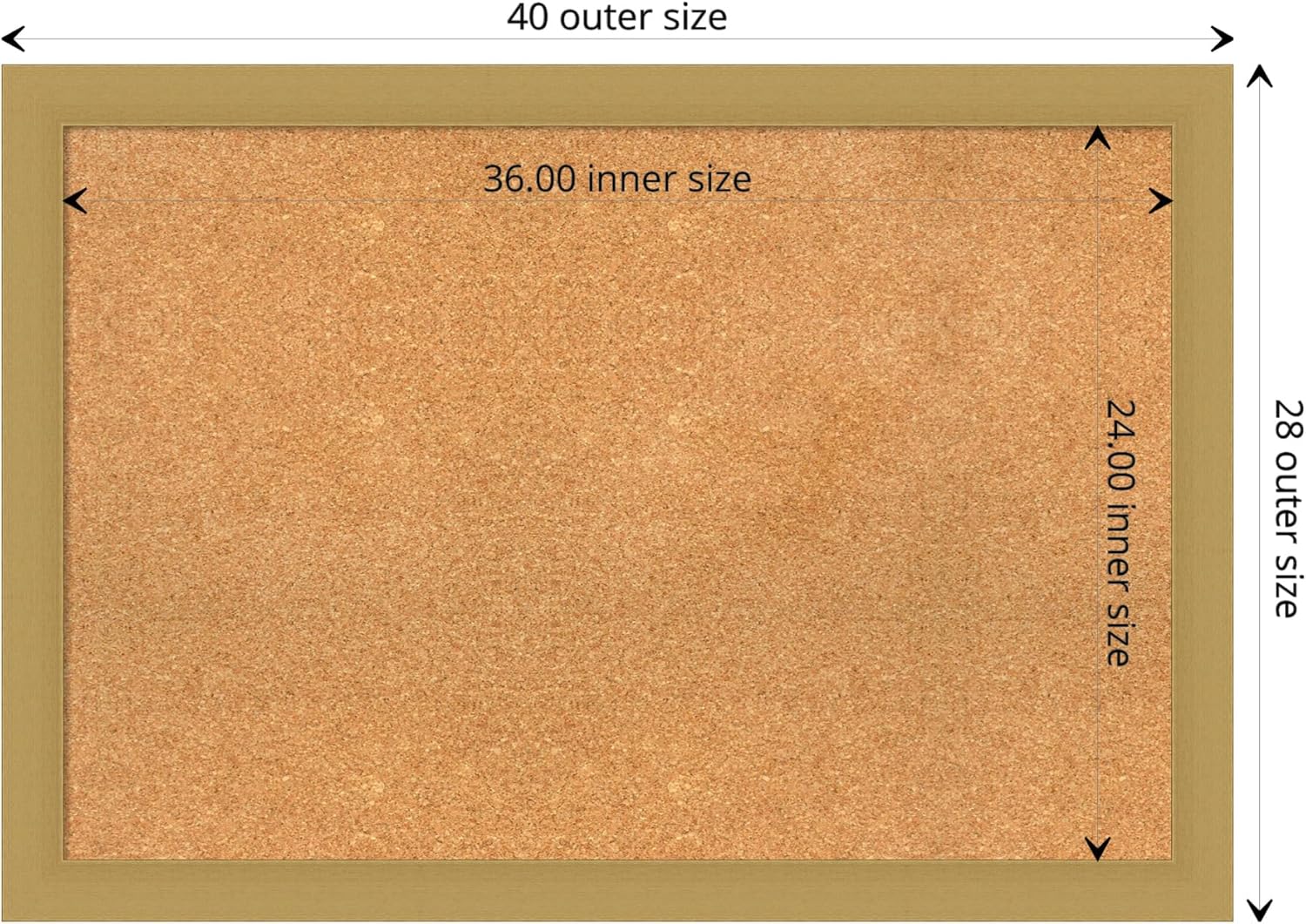- DIMENSIONS: The overall size of this framed cork board measures 40 in. x 28 in., including the frame. Its functional cork board area measures 36 in. x 24 in.