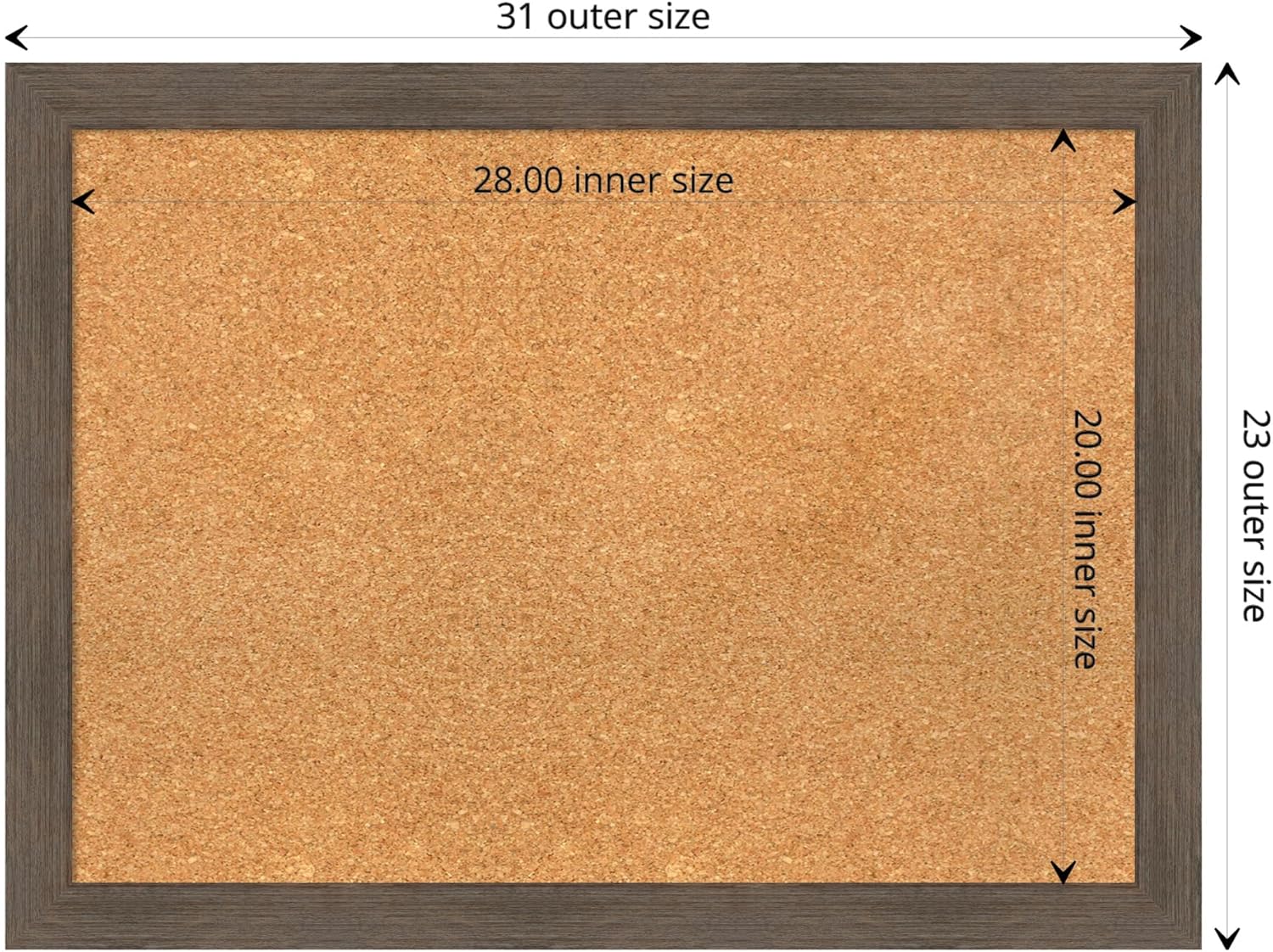- DIMENSIONS: The overall size of this framed corkboard measures 31 in. x 23 in., including the frame. Its functional cork board area measures 28 in. x 20 in.