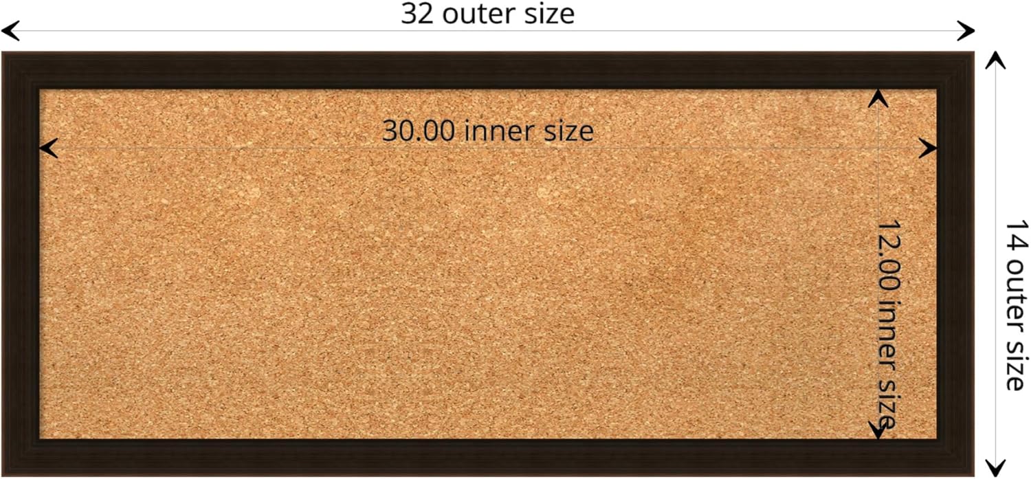 - DIMENSIONS: The overall size of this framed corkboard measures 32 in. x 14 in., including the frame. Its functional cork board area measures 30 in. x 12 in.
