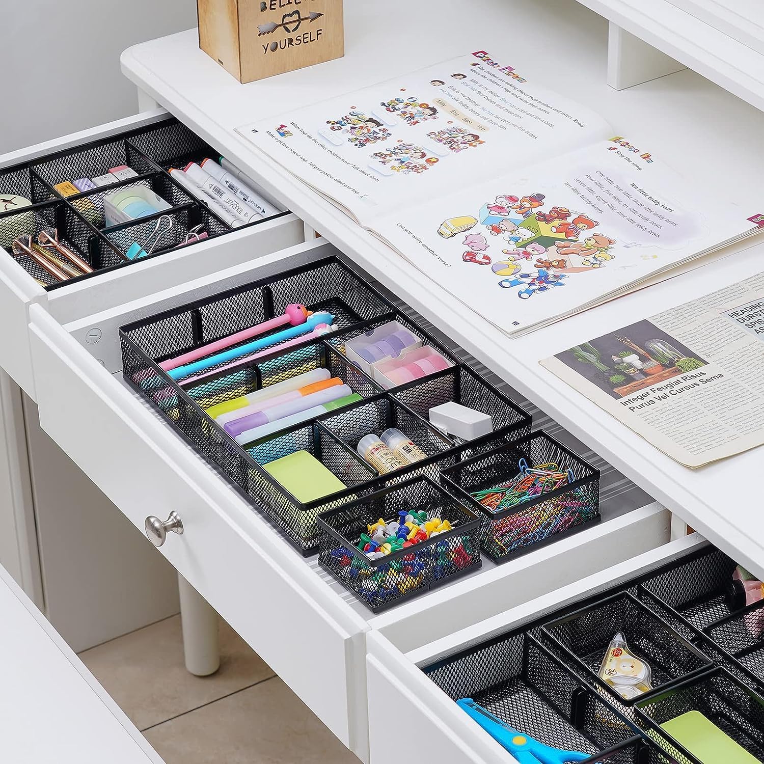 - ăCustomizable Compartments SizeăThe 6 removable dividers can be combined in any size you need to fit different stationery such as pens, erasers, highlighters, notes, staplers, tapes, clips or other supplies.