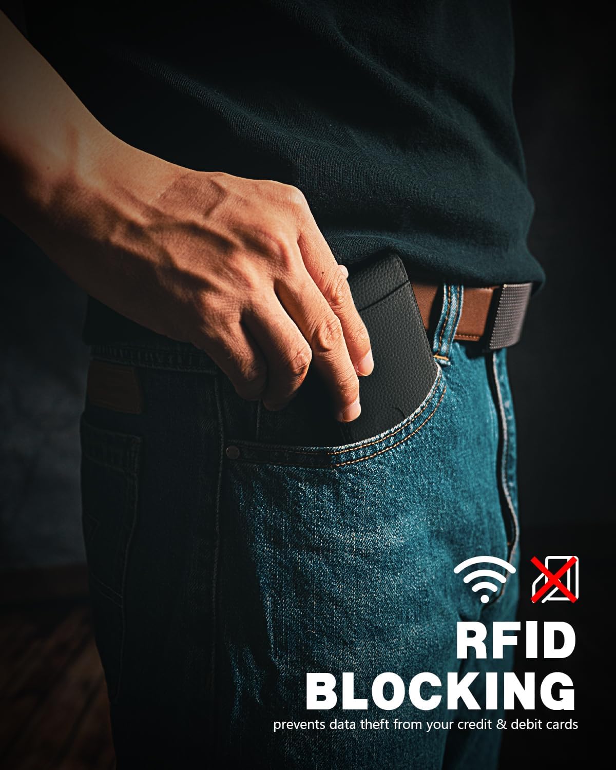 • RFID Anti-Theft SECURITY - This slim wallet for men is equipped with German Institute Certified RFID Security technology, a unique metal composite, engineered specifically to block 13.56 MHz or higher RFID signals to protect the valuable information and privacy