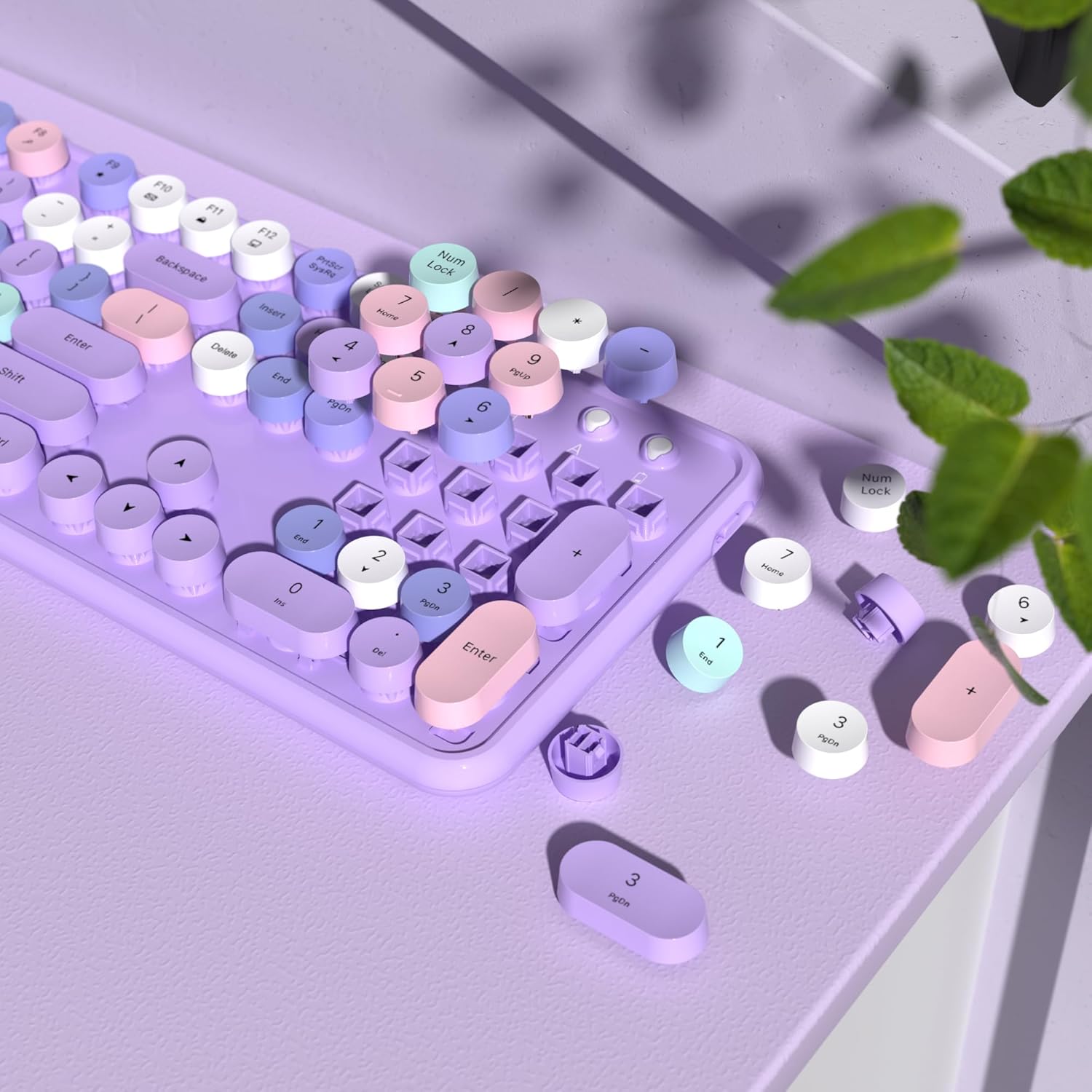 Colorful Wireless Keyboard and Mouse Combo, COVEVA 2.4GHz Wireless Retro Cute Round Keycaps Keyboard, 104 Keys Full-Sized Keyboard Mouse Set with Switch Button for PC Laptop Desktop (Purple Colorful)