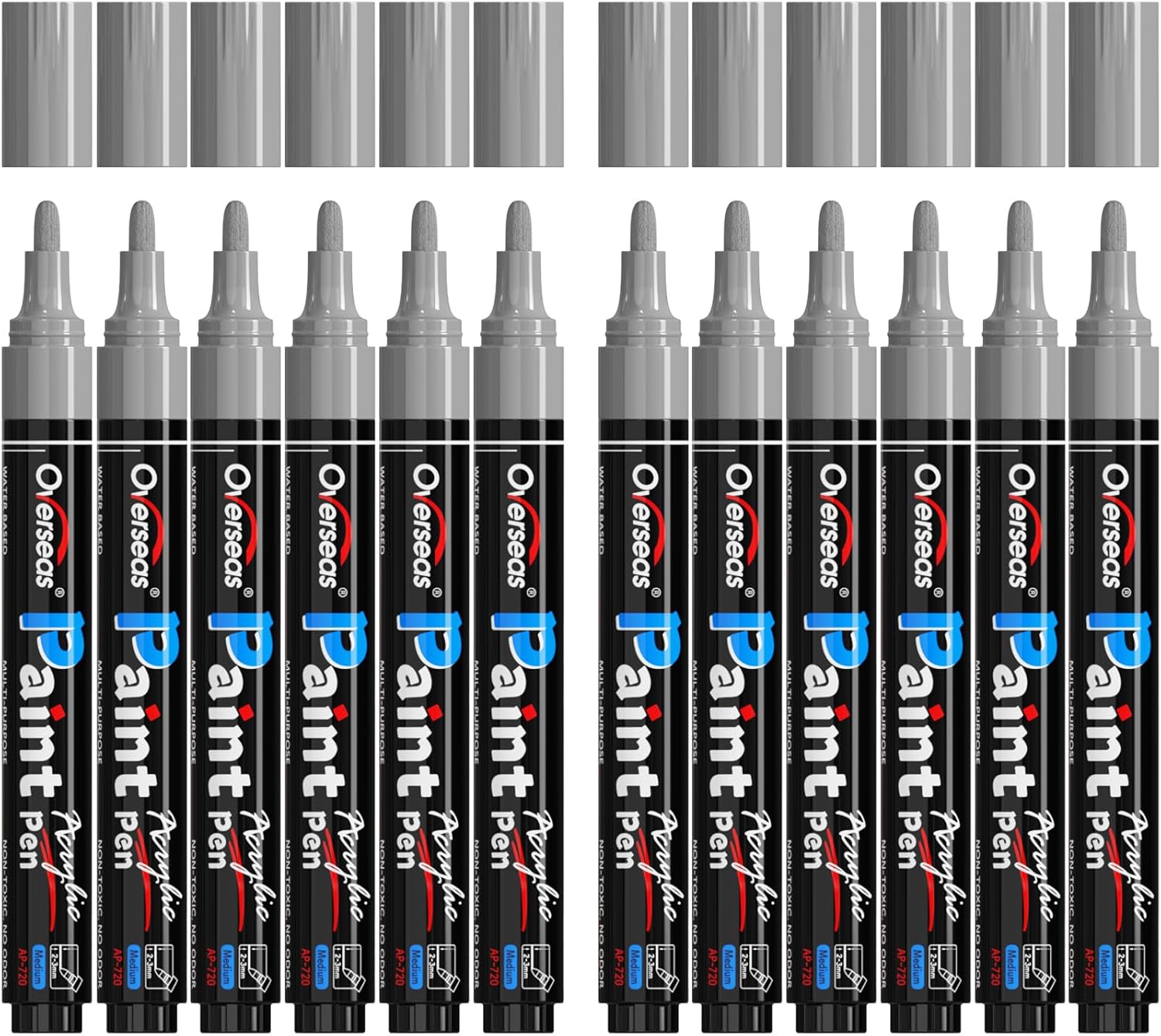 Overseas Silver Paint Pens Paint Markers - Permanent Acrylic Markers 12 Pack, Water-Based, Quick Dry, Waterproof Marker Pen for Rock, Wood, Plastic, Metal, Canvas, Glass, Mugs. Medium Tip