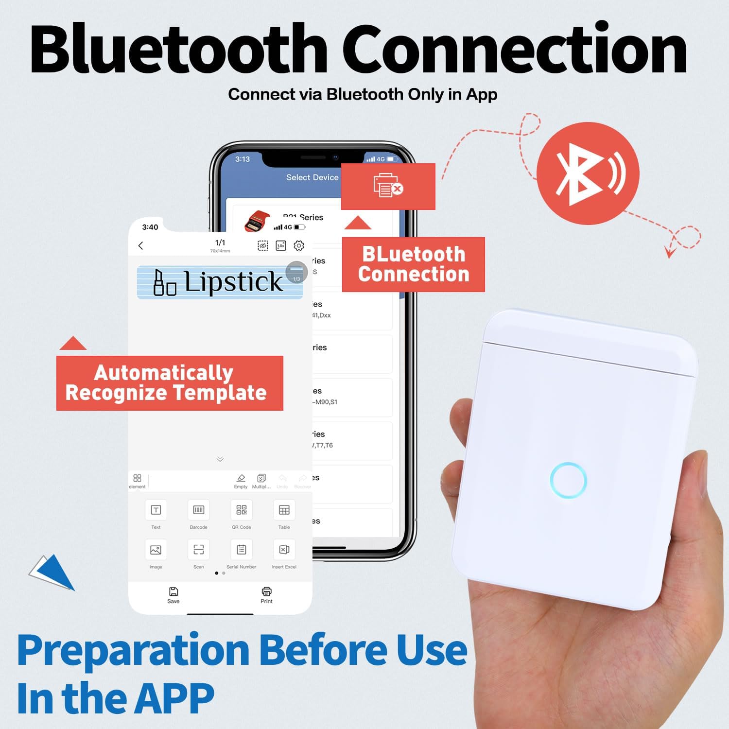 - 【ATTENTION & PRINT】 - The App is downloaded from APP STORE or Google Play and supports bar-code, qr code, picture, scan code, text, Excel import, smart OCR scanner, massive vivid icons, easily create your own customized labels , preview and save record, improving efficiency.It can be Large-capacity continuous printing, which can complete 50-160 more than one continuous repeat printing