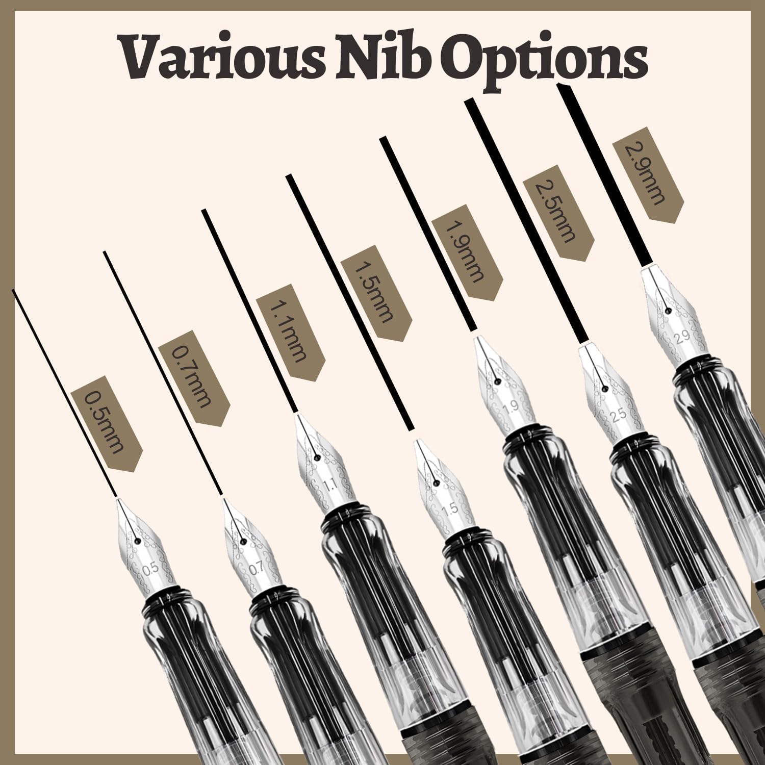 - Versatile Set: Calligraphy pen set contains 7 fountain pens with different nib widths (0.5 mm, 0.7 mm, 1.1 mm, 1.5 mm, 1.9 mm, 2.5 mm, 2.9 mm) and 40 ink cartridges in 11 colours, fit for various font styles and meets your writing and drawing needs
