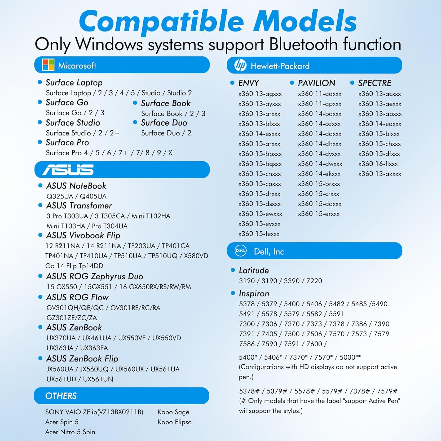 - General compatibility 一 Surface Pro (3rd/4th/5th/6th/7th/7+/8th/9th/10th gen), Surface Duo (1st/2nd gen), Surface Book (1st/2nd/3rd gen), Surface Studio (1st/2nd/2+ gen), Surface Laptop (1st/2nd/3rd/4th/5th gen), and other Compatible with computers running Windows 10 or 11 and supporting MPP 1.5 or MPP 2.0.