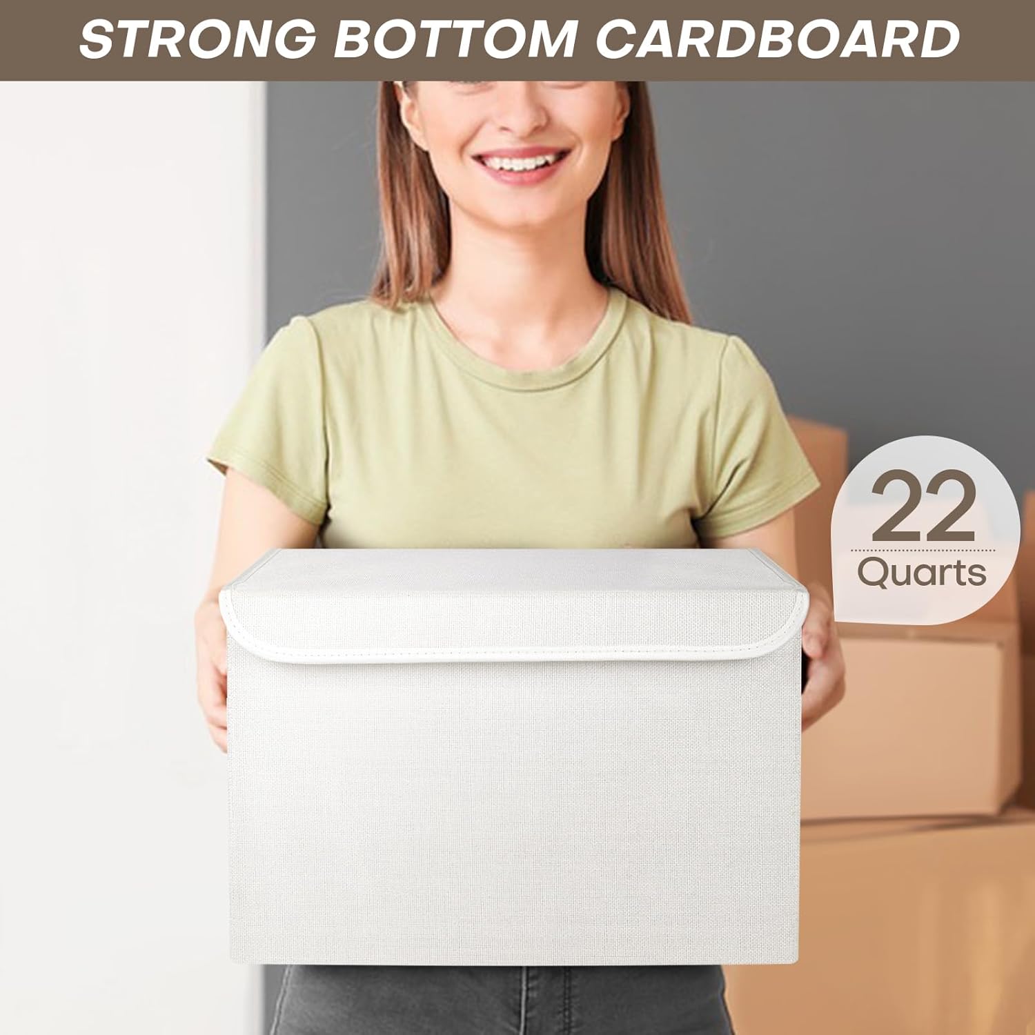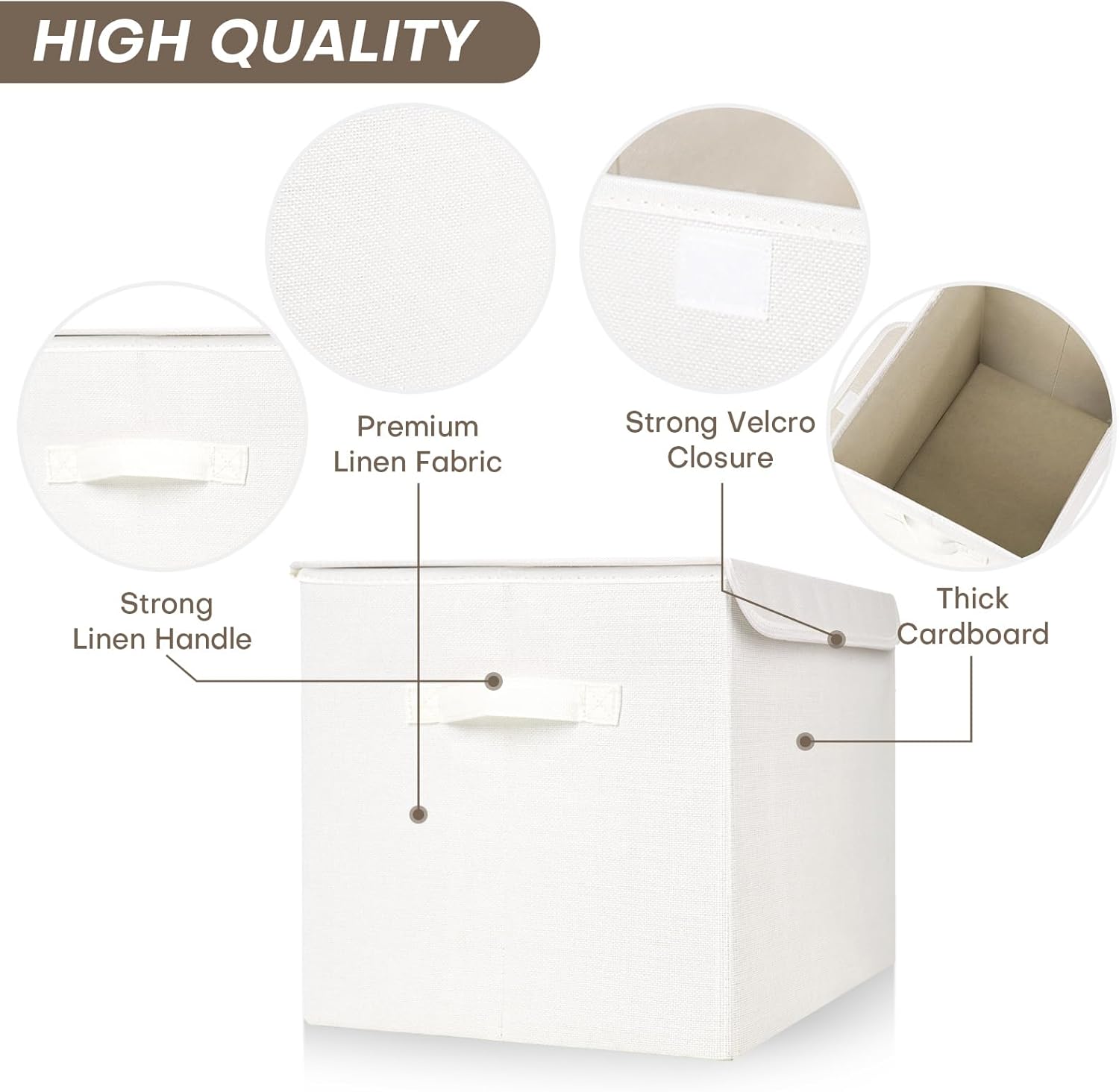 Large 22 Quart Linen Fabric Foldable Storage Bin Cube Organizer Basket with Flip-Top Lid & Handles, Clothes Blanket Box for Home, Office, Closet, White, 4 Pack 14.6 x 9.5 x 9.5”