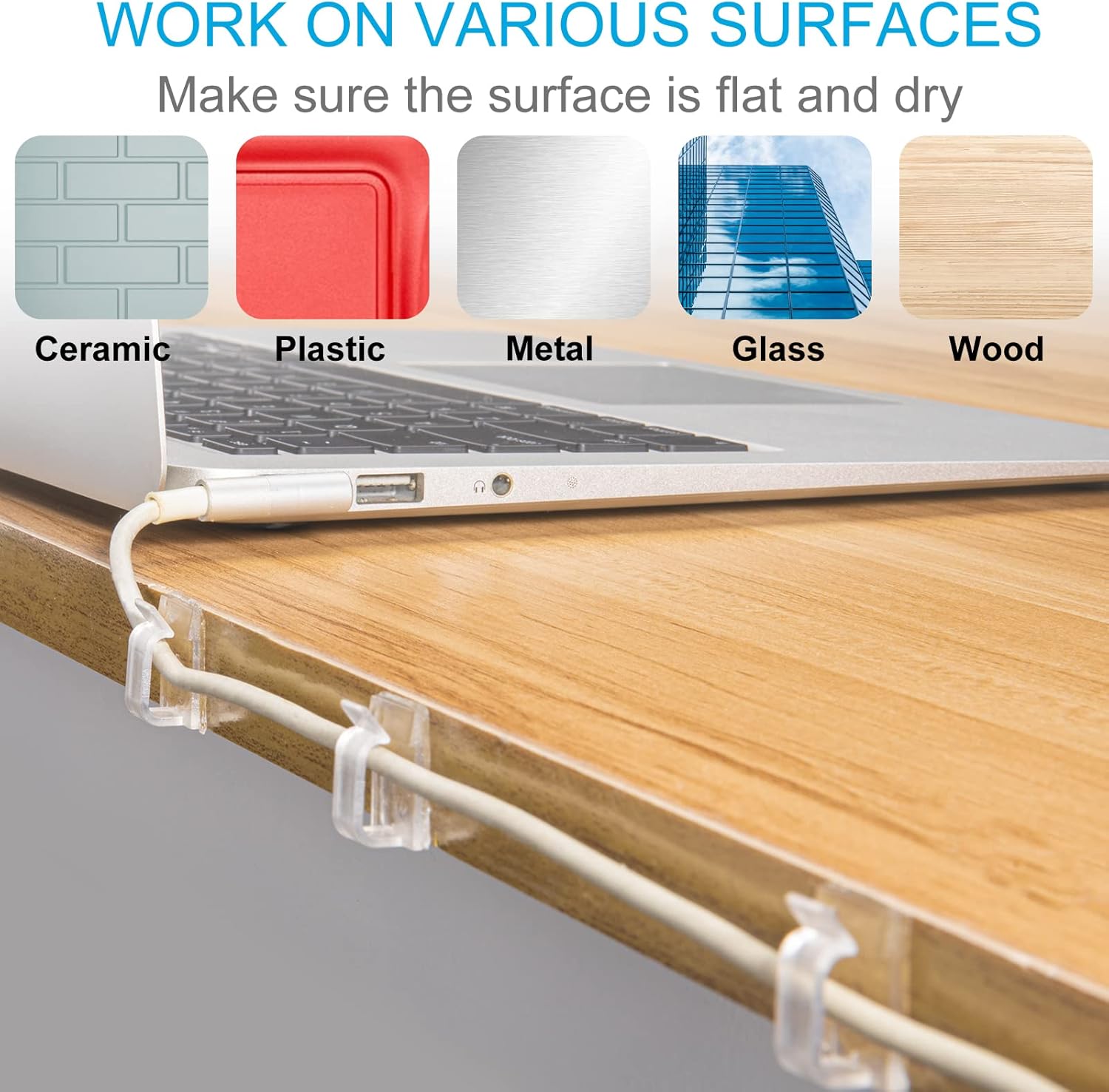 - Wide application: Size: 0.63 in*0.61 in*0.33 in, those cable management clips are suitable for wire diameter within 0.2 inch: outdoor lights, USB cords, cell phone chargers, ethernet cable, electric wires. Work perfectly on wall, glass, desk, metal surface.