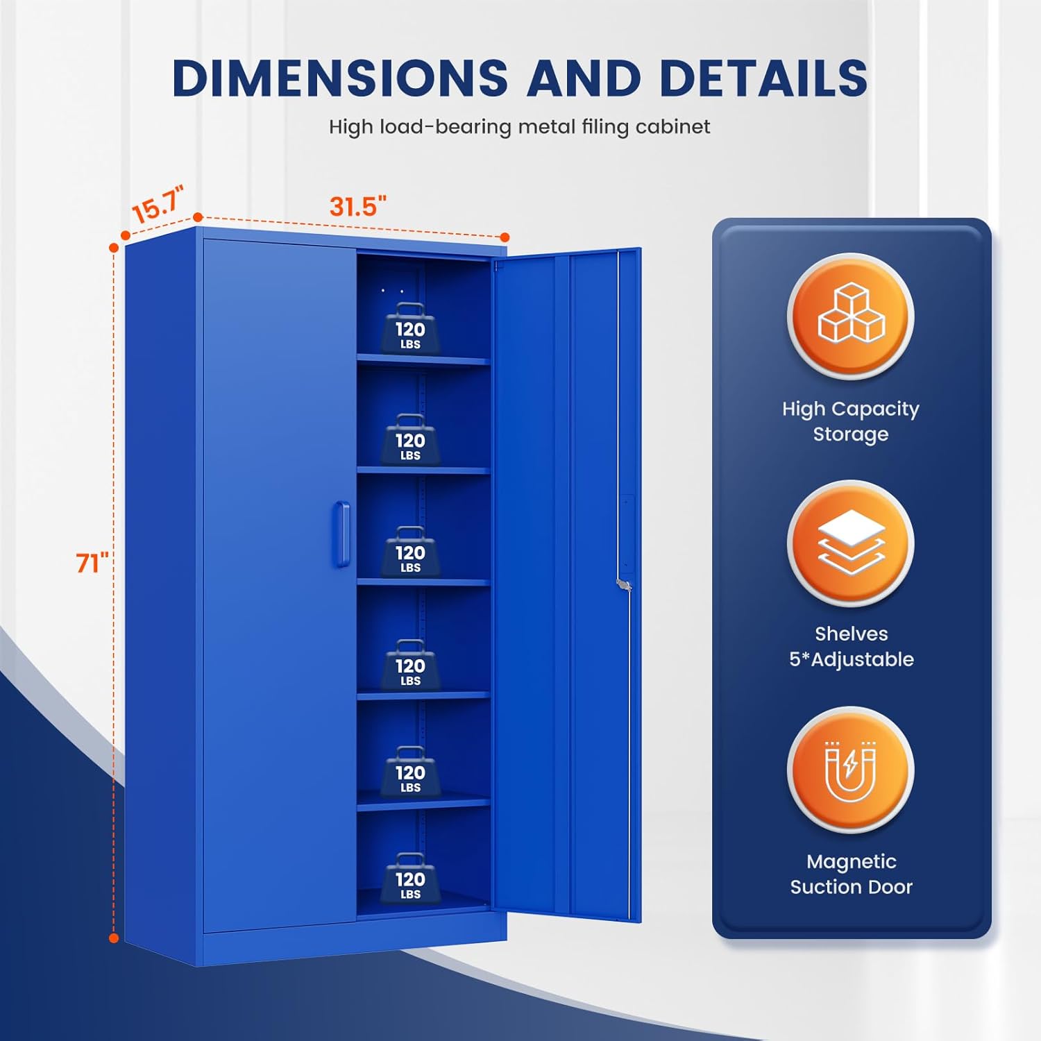 - ăWEIGHT CAPACITYă: Sturdy and reliable - each of the 5 shelves in this tall cabinet can hold up to 180lbs, With a heavy duty metal frame, these shelves will stabilize their contents and protect them.Whether you want to store office files, garage tools, or other large and heavy items, it's no problem.