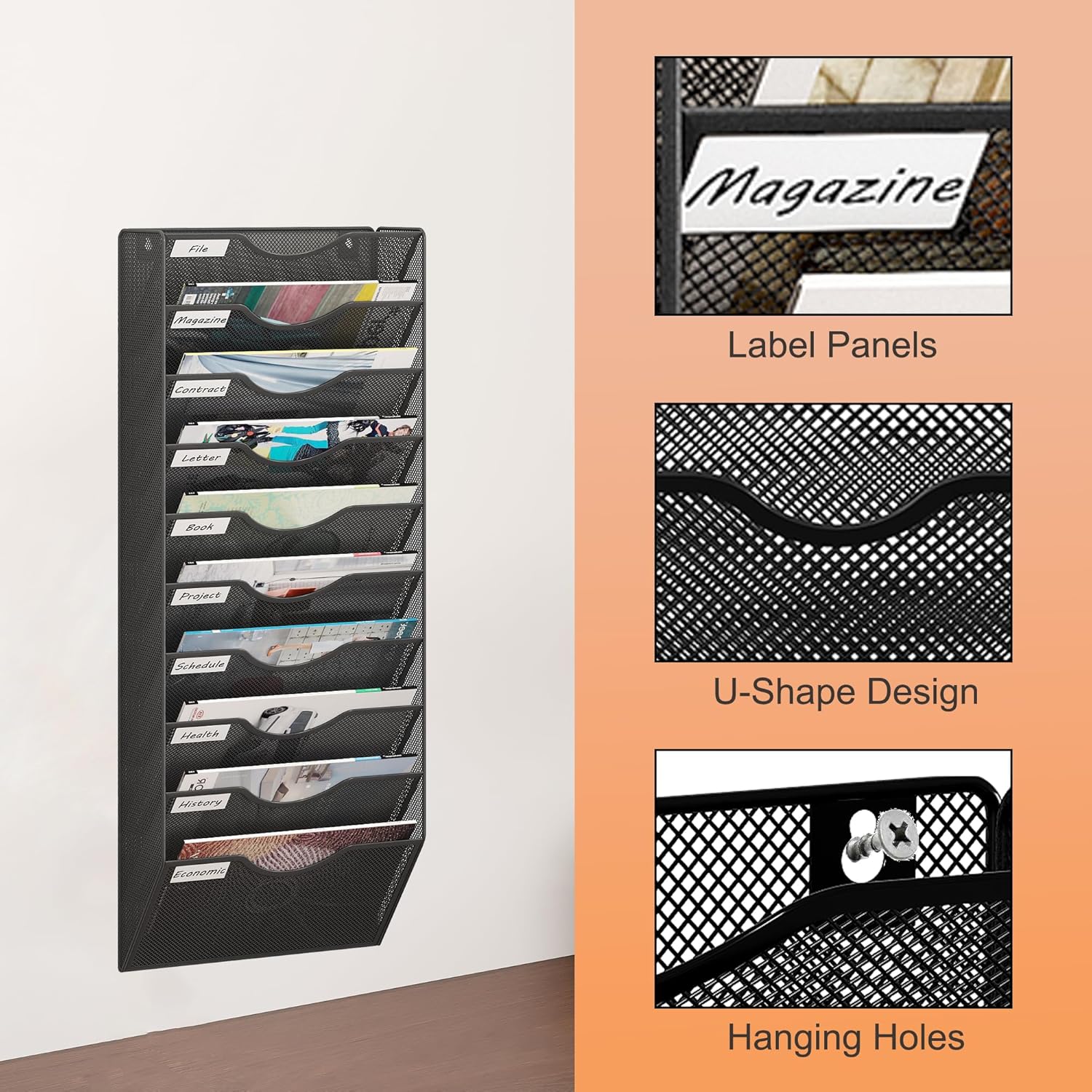 10 Tier Hanging Wall File Holder, Metal A4 Wall Mounted Document Holder, Vertical Hanging Mail Organiser, Magazine Storage Rack with Tray for Office Home Classroom, Black