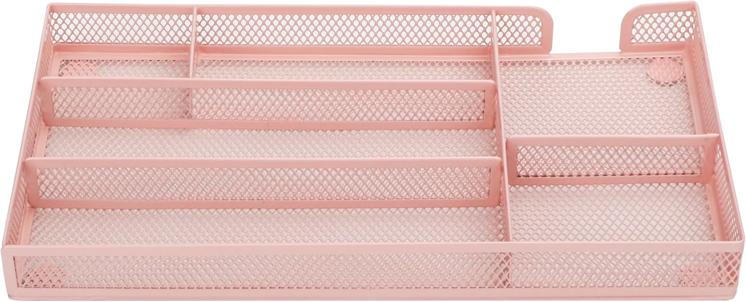 Annova Desk Drawer Organizer Tray for Office Organization - Metal Mesh - Storage Tray with Dividers for Pens, Desktop Accessories, Bathroom, Kitchen, Makeup and Office Supplies (Small, Light Pink)