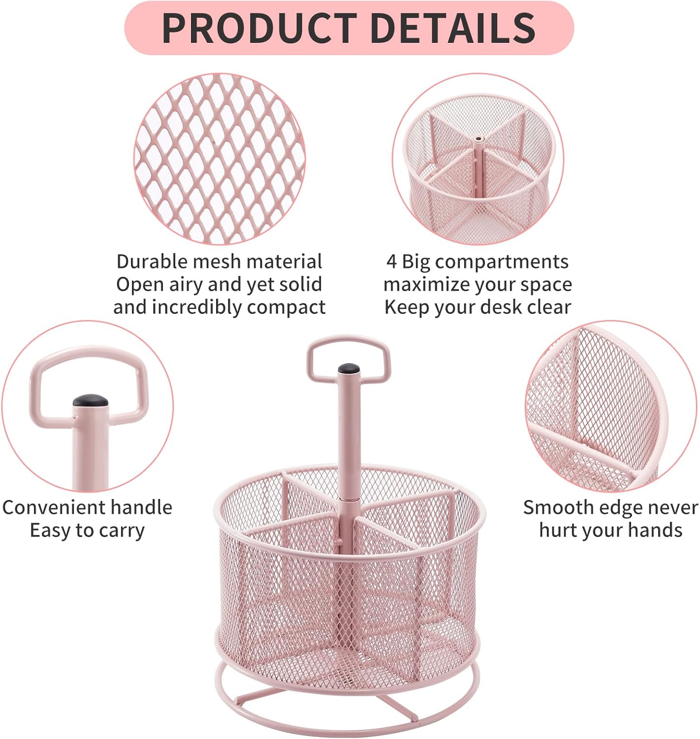 Marbrasse Mesh Desk Organizer, 360-Degree Rotating Multi-Functional Pen Holder, 4 Compartments Desktop Stationary Organizer, Home Office Art Supply Storage Box Caddy (Pink)