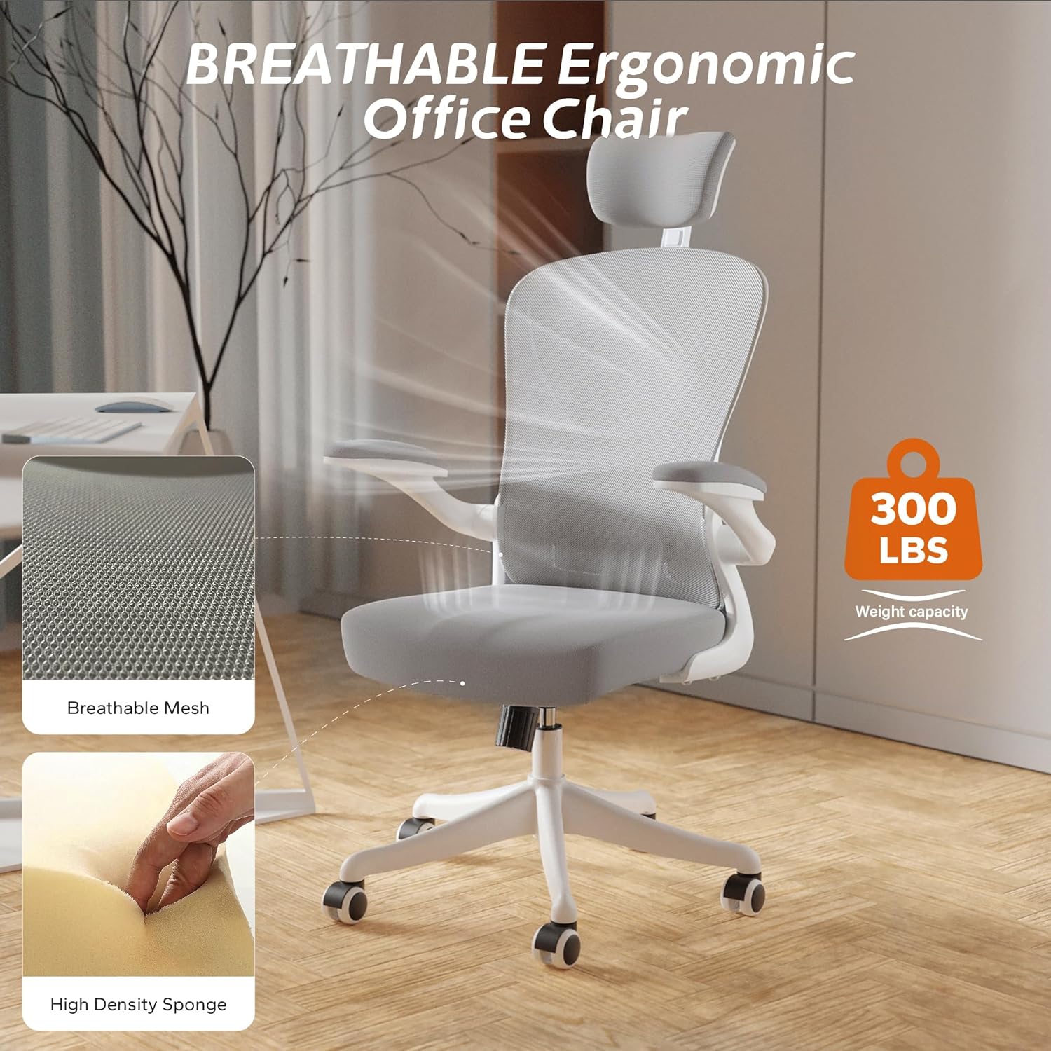Ergonomic Office Chair with Adjustable Lumbar Support & Flip-Up Armrests - High Back Computer Desk Chair with Thickened Seat Cushion, Rolling Wheels for Home/Office Study Work
