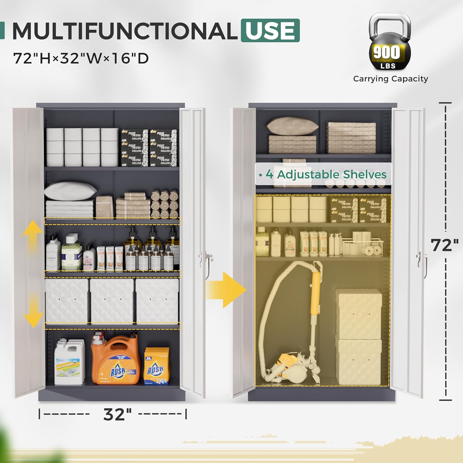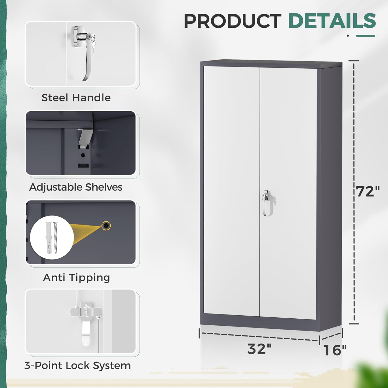 Greenvelly Metal Garage Storage Cabinet, Tall Steel Storage Cabinets with 2 Doors and 4 Adjustable Shelves, Metal Tool Cabinets, Locking File Cabinet for Home Office, Garage, School (Gray White)