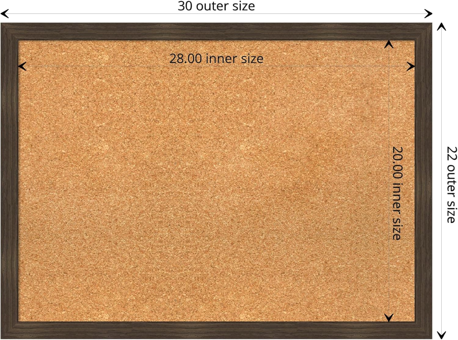 - DIMENSIONS: The overall size of this framed corkboard measures 30 in. x 22 in., including the frame. Its functional cork board area measures 28 in. x 20 in.