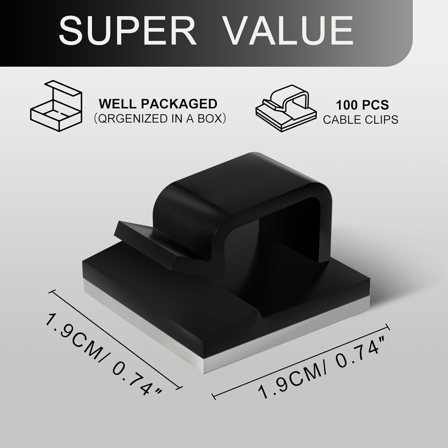 - Adhesive Cable Clips: Made of high-quality PA66 material and strong adhesive, strong and durable. No drilling is required for use, no residue is left behind, and the surface will not be damaged. Set contains 100 cable clips, cable clips size: 19x19x12mm.