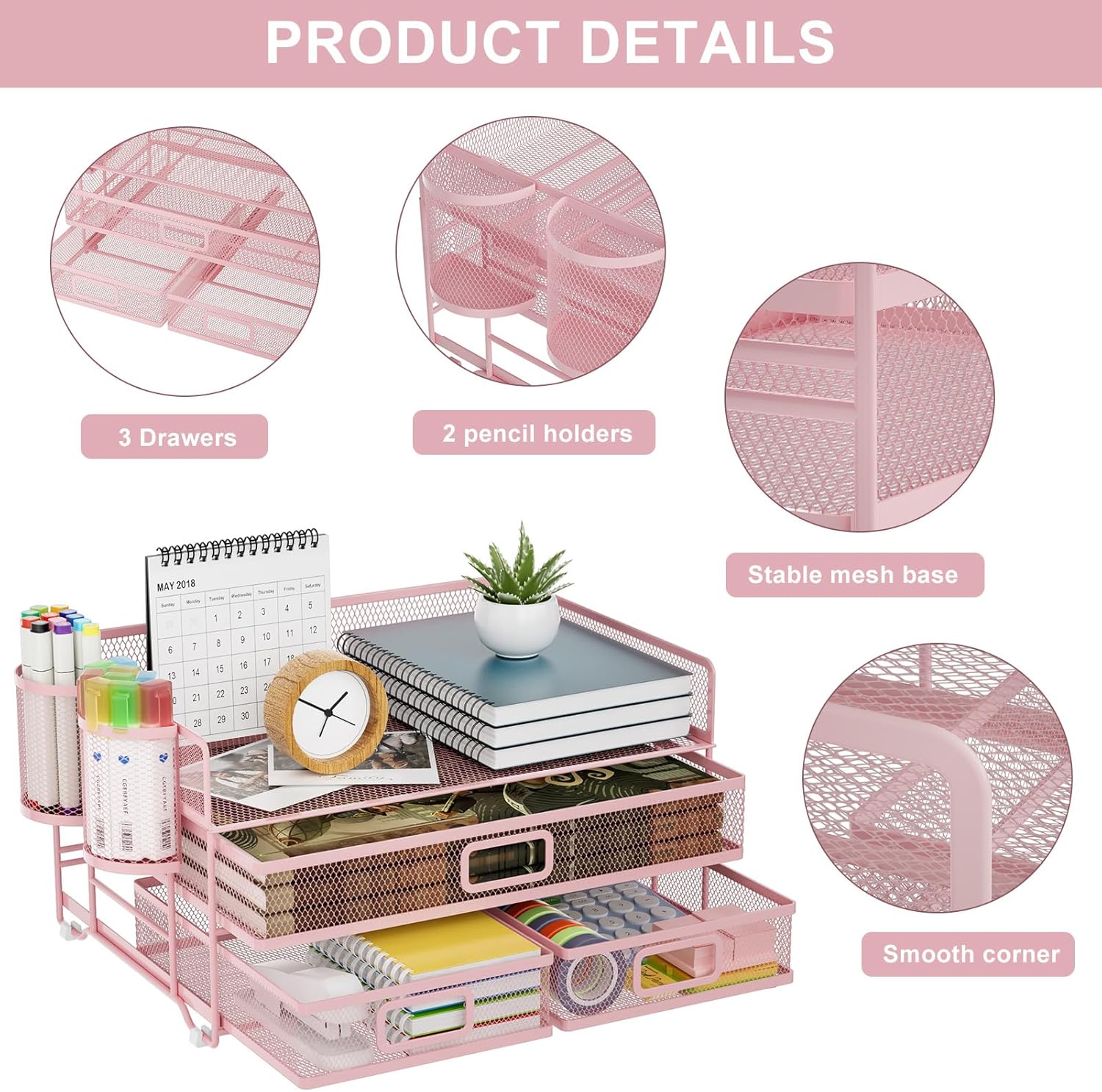 Marbrasse 3 Tier Mesh Desk Organizer with Drawer, Multi-Functional Desk Organizers and Accessories, Paper Letter Organizer with 2 Pen Holder for Home Office Supplies (Pink)