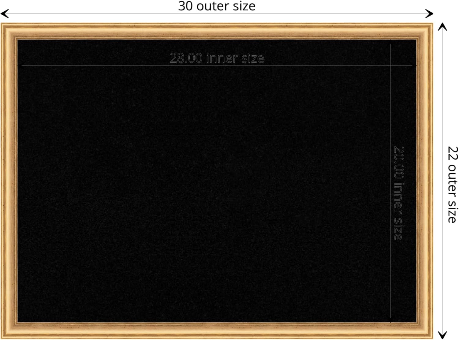 - DIMENSIONS: The overall size of this framed corkboard measures 30 in. x 22 in., including the frame. Its functional cork board area measures 28 in. x 20 in.