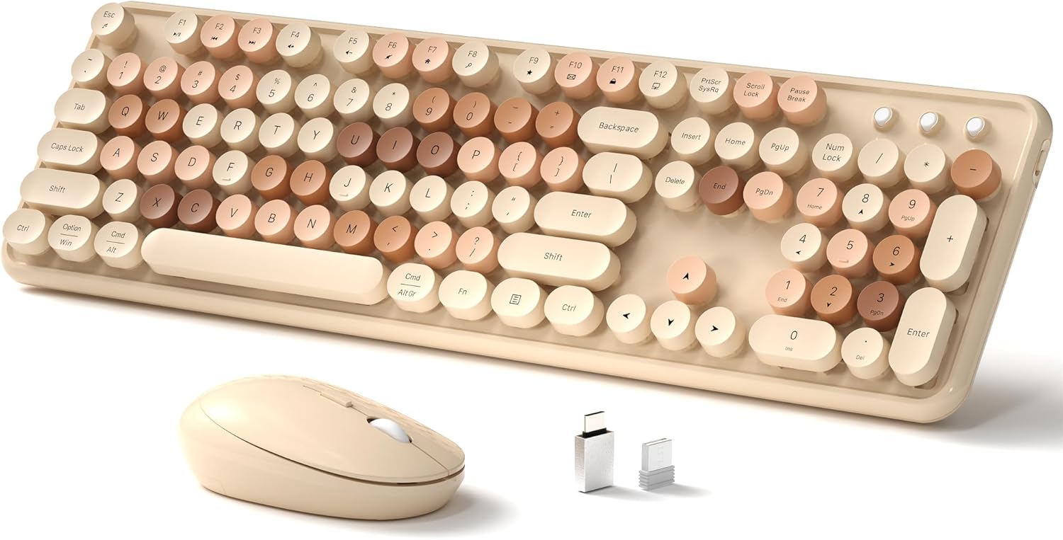 Wireless Keyboard and Mouse, Full-Size Retro Typewriter Keyboard with Round Keycaps, 2.4GHz for Windows, Mac, Laptop, PC, Desktop (Milky Tea Colorful)