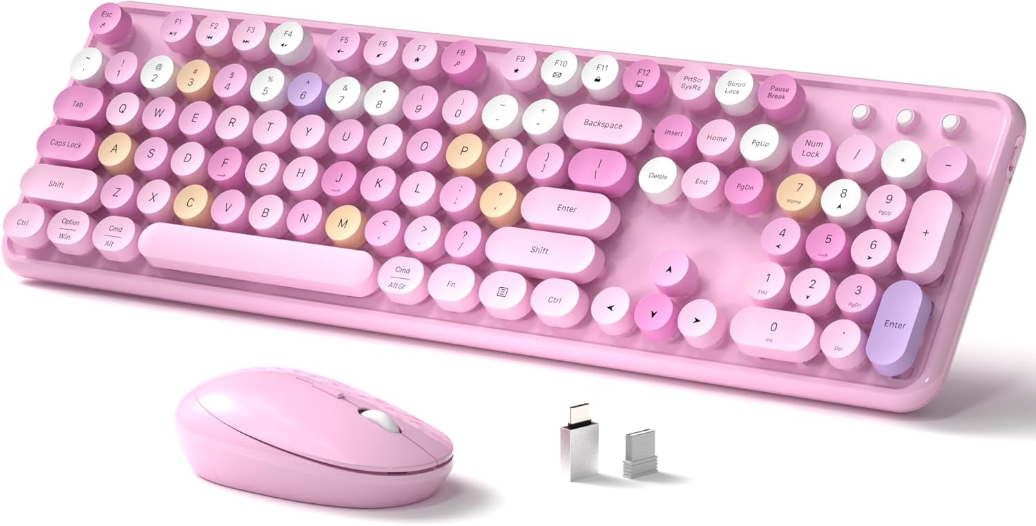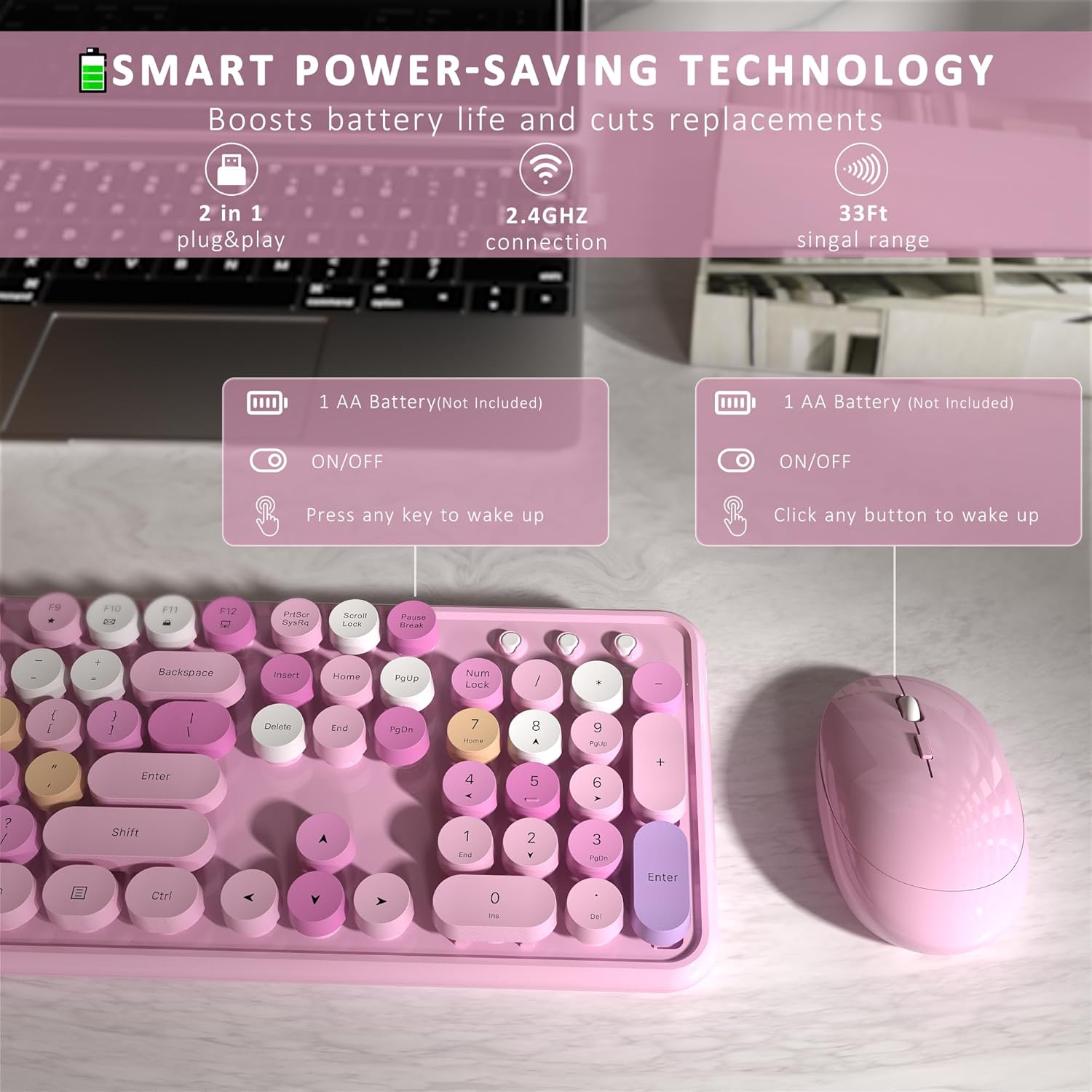 Wireless Keyboard and Mouse, Full-Size Retro Typewriter Keyboard with Round Keycaps, 2.4GHz for Windows, Mac, Laptop, PC, Desktop (Pink Colorful)