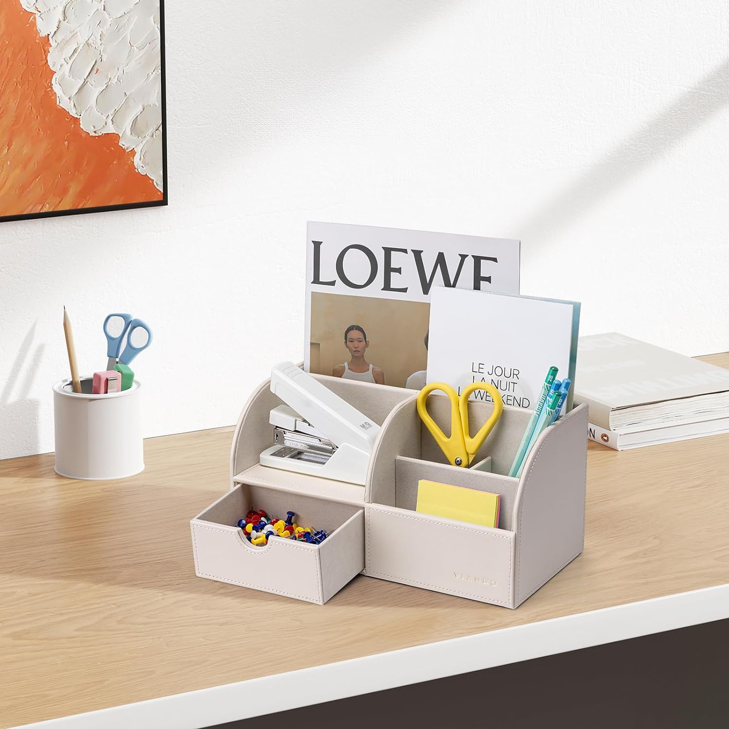 Vlando Office Supplies Desk Organizer Caddy, PU Leather Office Organization and Storage,Desktop Hanging File Letter Document Storage Holder with Drawer Beige