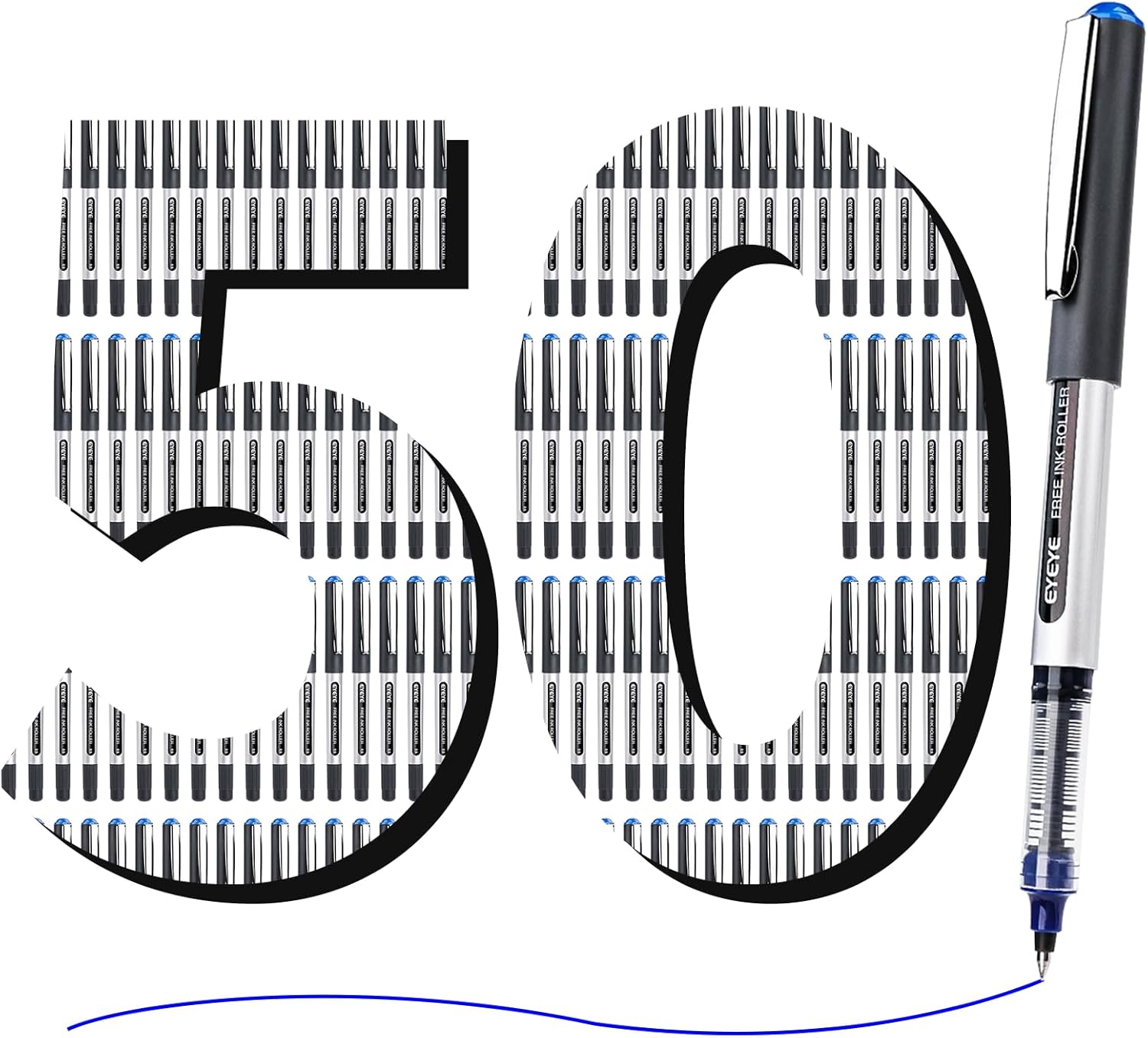 EYEYE 0.5mm Rollerball Pens Blue, 50 Pack Extra Fine Point Liquid Ink Roller Ball Pen Quick Dry, Blue Ink Pens Fine Point Smooth Writing Pen for Journaling, Note Taking, Office, School Supplies