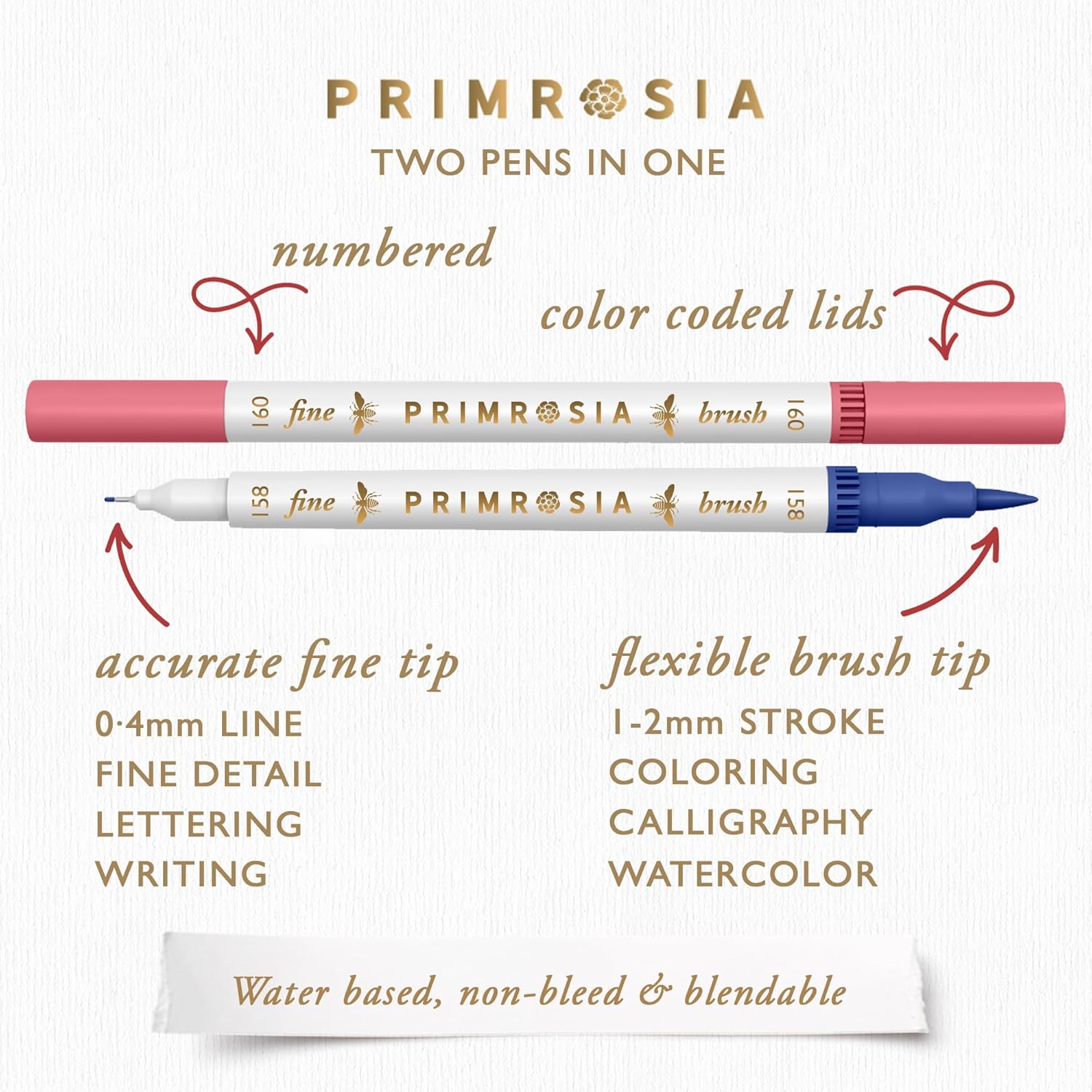 - Two tips on the one marker: On one end is a watercolor felt tip brush that offers stunning color and vibrancy to create gorgeous brush strokes that are blendable for shading and coloring. At the other end is a 0.4 fineliner for outlining and detail