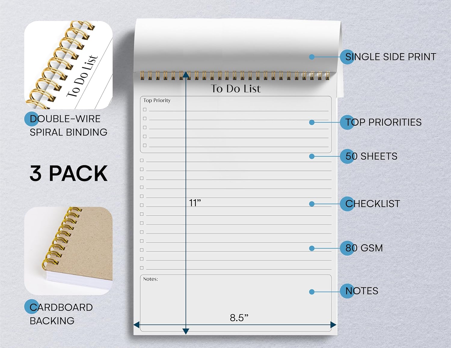 - 50 SHEETS PER PAD/150 TOTAL SHEETS - Created so you can pack all your tasks onto one sheet in order to set and achieve goals, plan and complete projects, and stay organized no matter how you use your notepad.