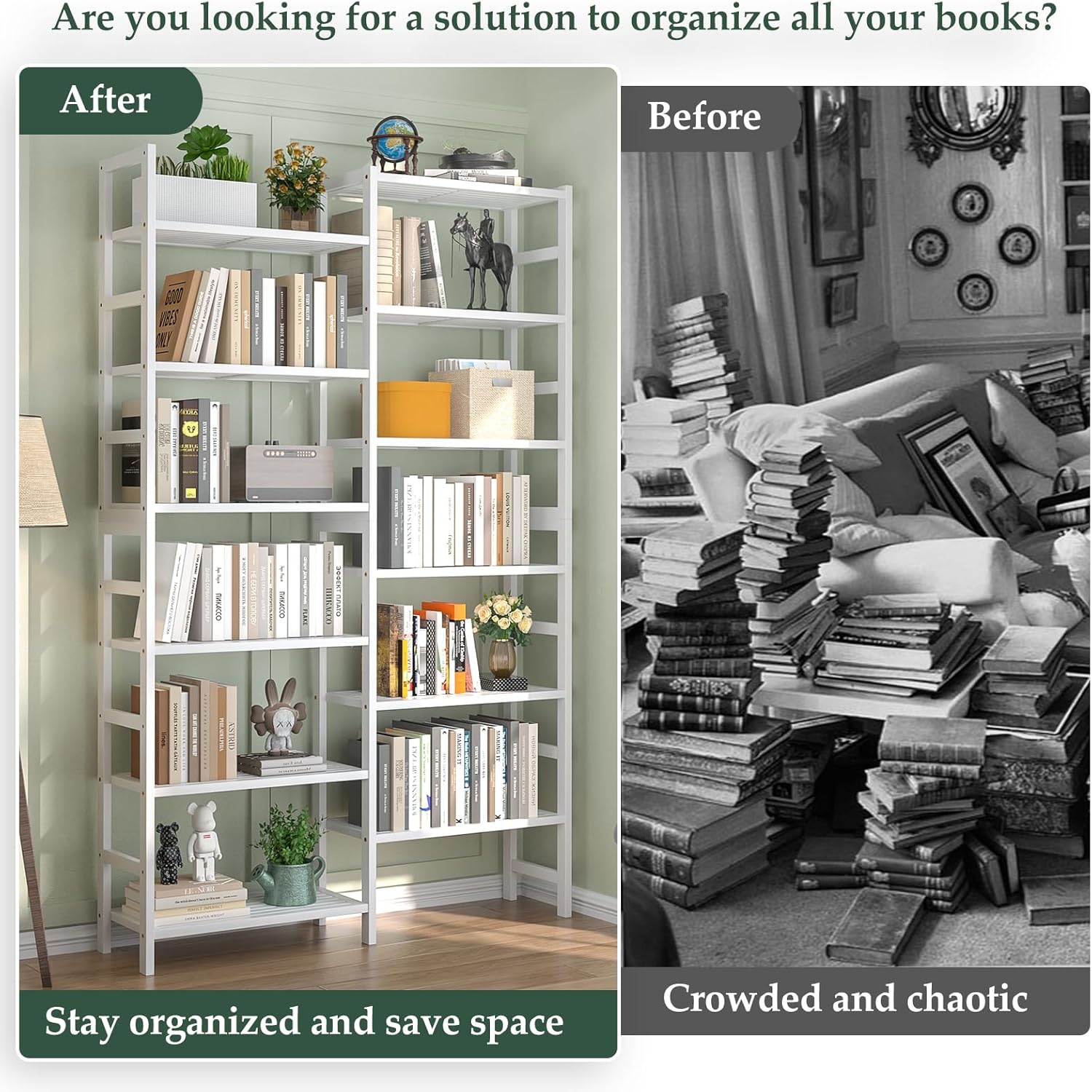 Homykic Double Wide Bamboo Bookshelf White, 6-Tier Large Open Bookcase with 12 Display Shelves, 6ft Tall Freestanding Book Shelf for Home Office, Bedroom, Living Room, Plants