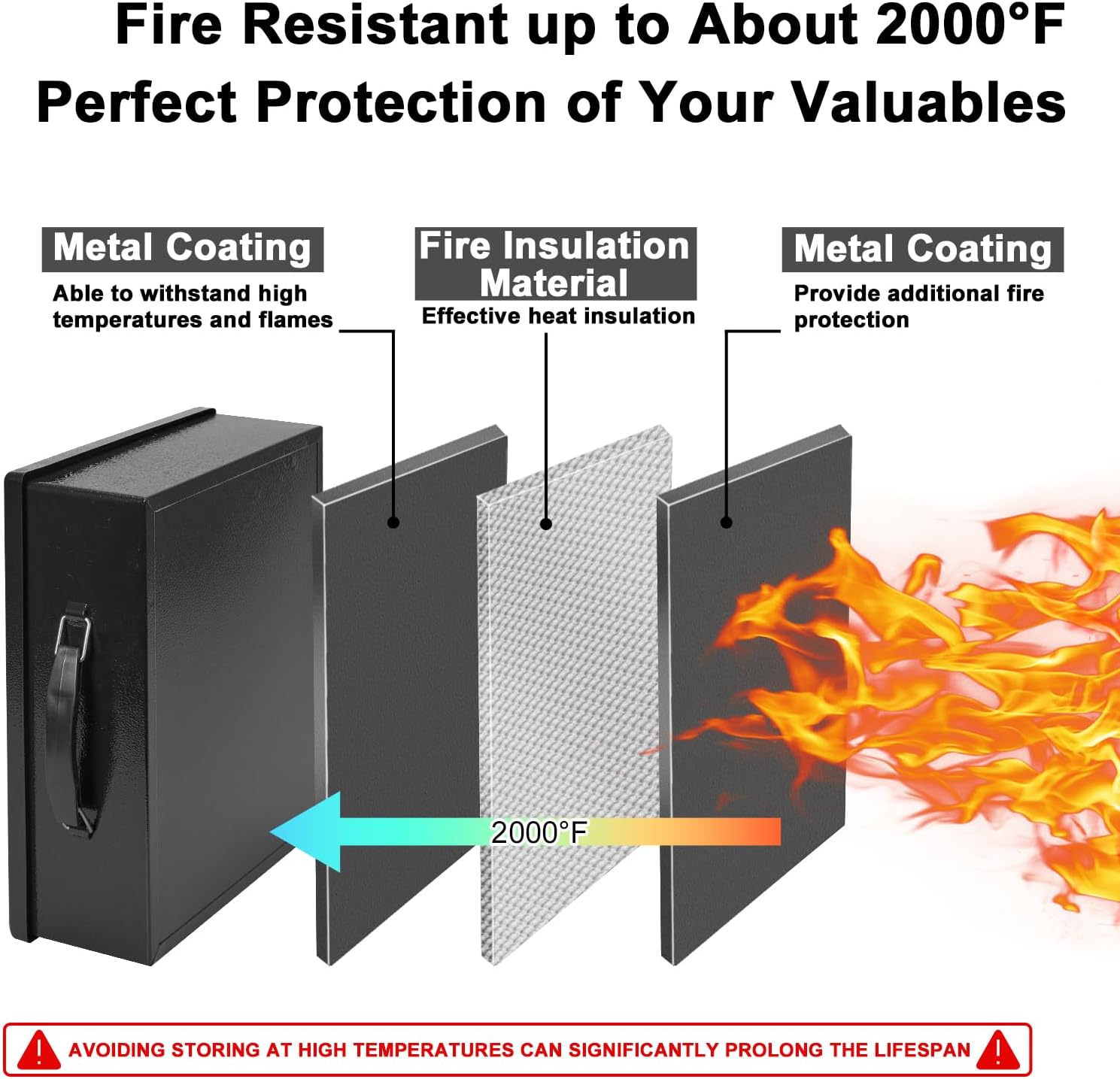 - ππππππππ π πππ ππππππππππ:Our key lock fireproof document box is designed with a double-layer construction on all sides, providing superior fire resistance. The inner layer features a layer of fire retardant material, that is highly effective.This unique safe design ensures maximum protection for your valuable documents and belongings in the event of a fire.