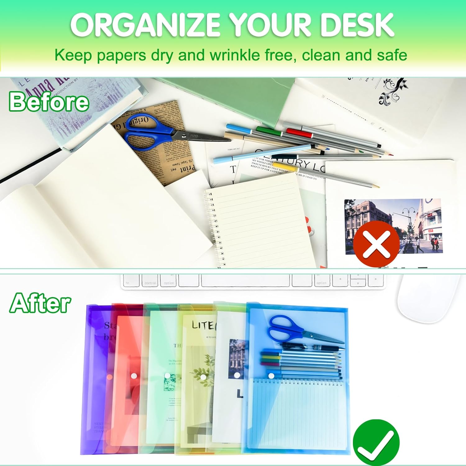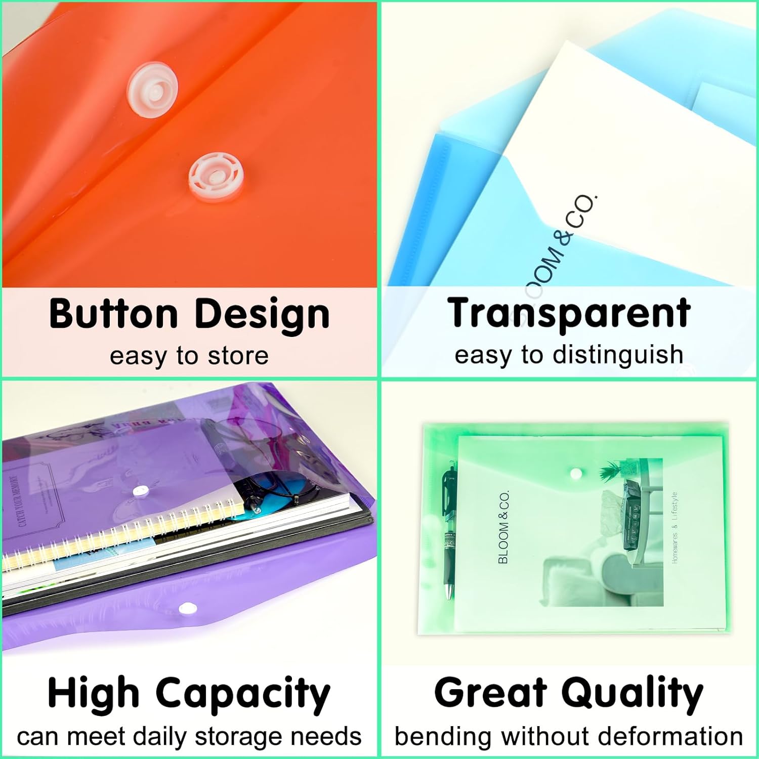 - Quantity: you will receive 18 A4 size plastic envelopes poly envelopes with snap closures which contain purple green blue yellow pink white there are a lot of them, which can meet your needs for storing and organizing a large number of documents at one time