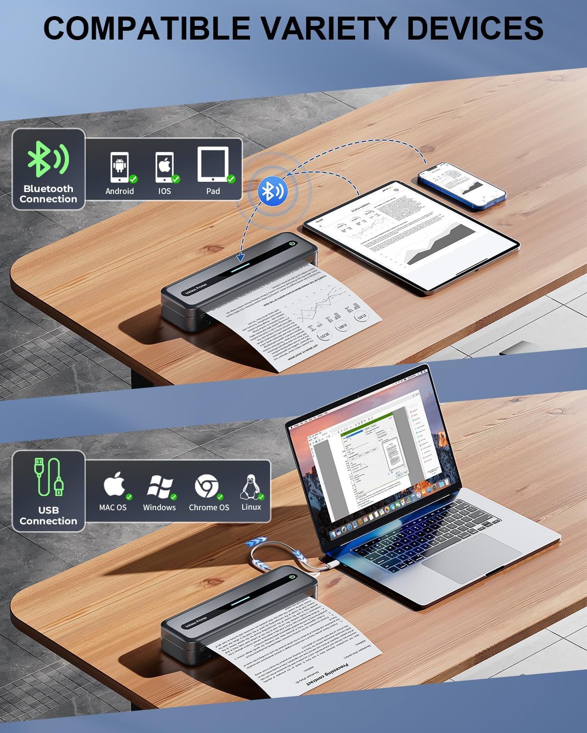 - DEVICE-FRIENDLY PRINTING: Go wireless! Print wirelessly from your phone or tablet via Bluetooth. The wireless bluetooth printer works with iOS, Android. For computers, plug in the USB. Compatible with Windows, Mac, Linux, Chrome, and Win ARM systems. Easy printing for everyone!