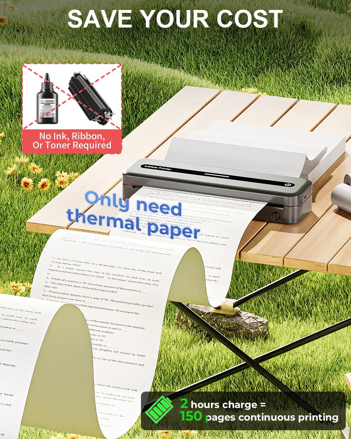 - SAVE CASH & TIME: COLORWING inkless printer! No ink, ribbon, toner - $0 cost wonder! Just grab thermal paper. Cleaner, handier, no health risks! Small slim printer, big capacity. 2-hour charge = 150 sheets non-stop!