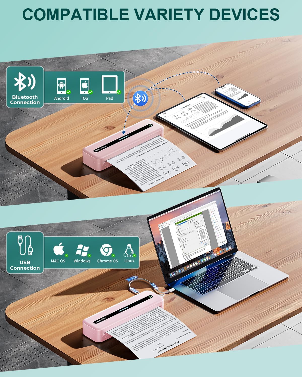 - COMPATIBLE VARIETY DEVICES: When you use a mobile phone or tablet to print, no need cable, just connect your Bluetooth, support for IOS, Android system. When you use a computer to print, you need connect the USB, support for Windows, Mac, Linux, Chrome, Win ARM systems.