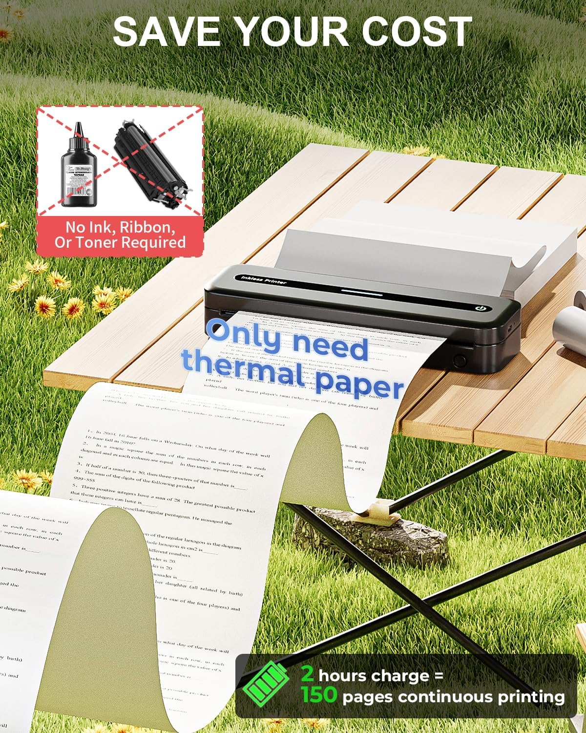 - SAVE YOUR COST AND TIME: COLORWING no ink printer don’t need ink, ribbon or toner $0 costing, only $0.14 thermal paper. More cleaner and more convenient, and does not jeopardize your human health. Small printer with large capacity, charging for 2 hours can print 300 sheets continuously.