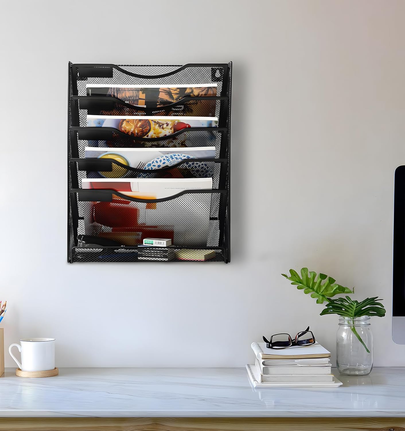 - Wall File Holder with Bottom Tray : 5 vertically arranged pockets for letter-sized files, easy storage and organization files, A4 folders, and documents. A flat tray at the bottom that can hold pens, pencils, scissors, rulers and other accessories.