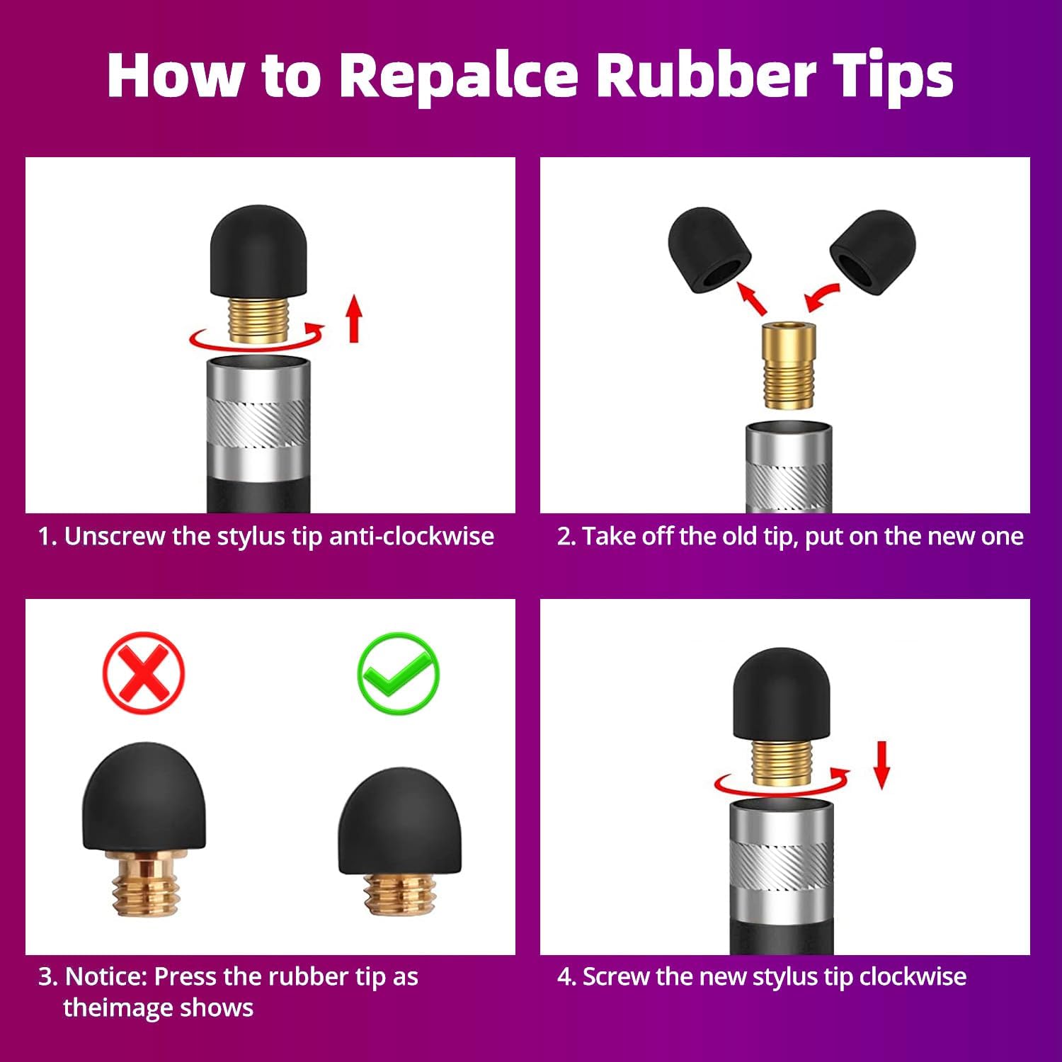 - [Replaceable spare tip & 5 colors] Two ends of the stylus pens both have replaceable rubber tips. It is easy to finish replacing process without any tool within seconds.The metal body and bright frosted texture make the stylist look more advanced.