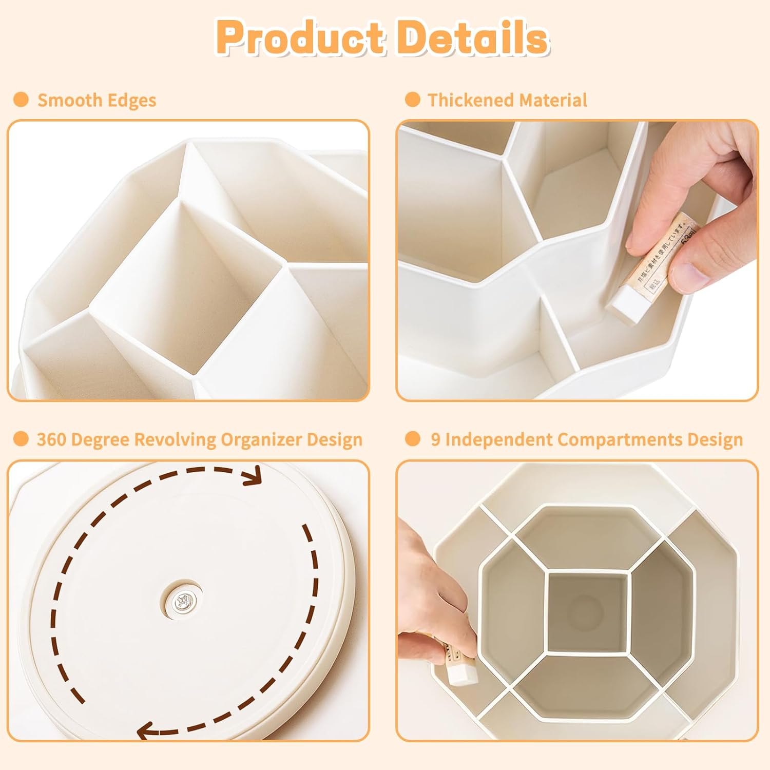 - ăPerfect design & large capacityăThis desktop organizer features a diamond-faced design with 9 high-capacity individual compartments to meet your every need. This turntable pencil holder for your desk is not only perfect for storing your desktop stationery such as pens, pencils, markers, highlighters, rulers, staplers, flash drivers, erasers, paper clips, scissors, letter openers, and many other desk widgets but also great for storing your makeup brushes, nail polishes, lipsticks, and other small personal items