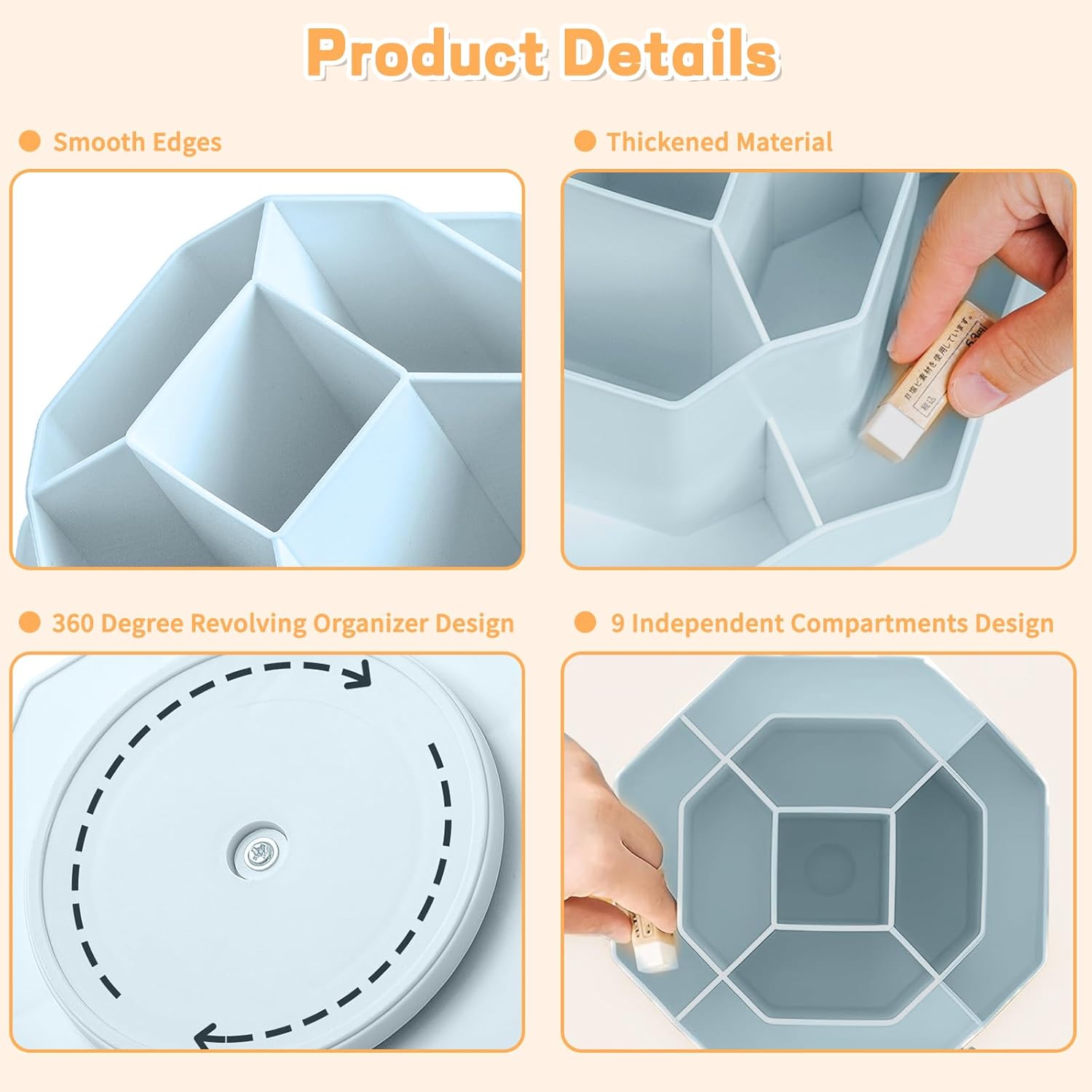 Pencil Pen Holder for Desk,9 Slots 360 Degree Rotating Desk Organizers,Desktop Storage Stationery Supplies Organizer, Cute Pencil Cup Pot For Office, School, Home(Blue)