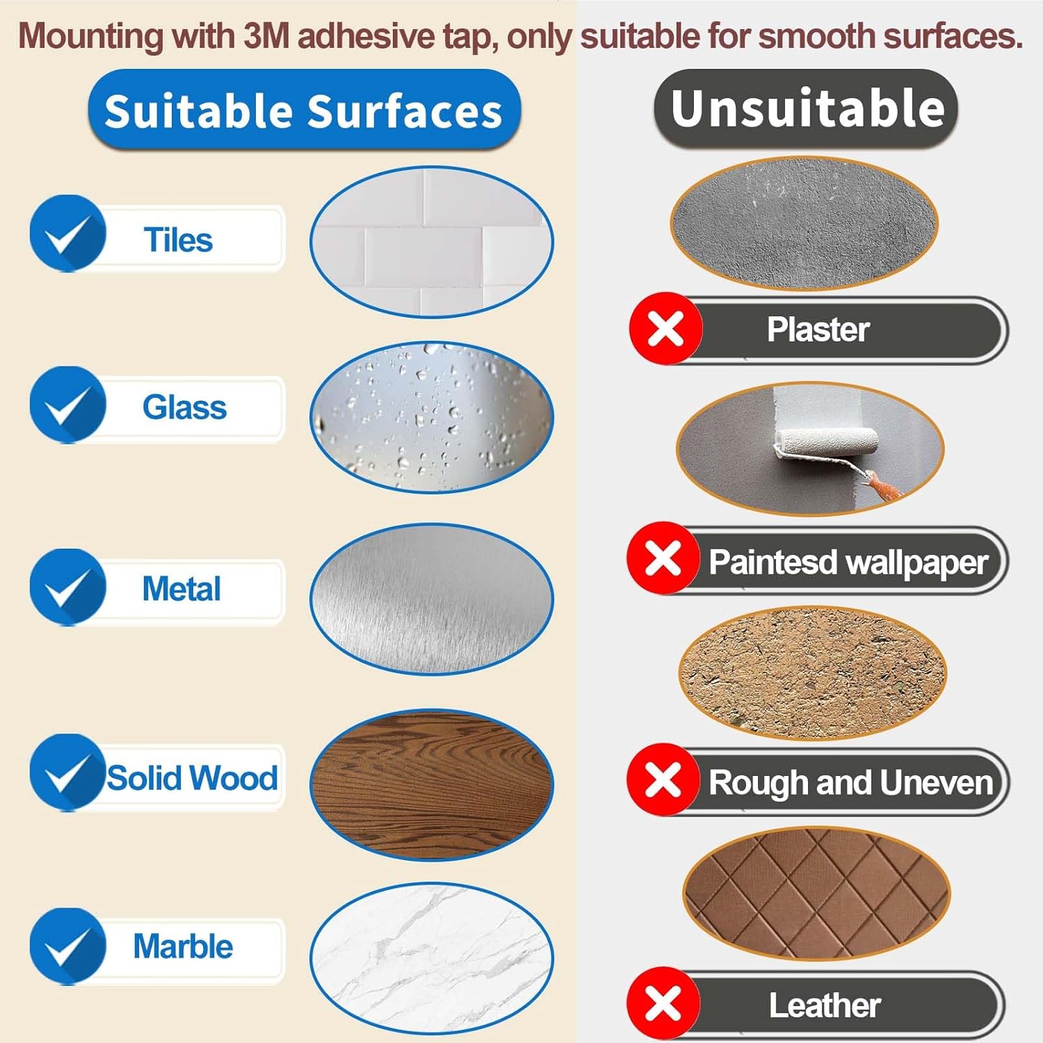 - 【No Drill Installation】Without the drills and mess, it comes with a sturdy adhesive sticker; just fix it to the holder's rear and press onto smooth surfaces like ceramic tiles, glass, metal, solid wood, plastic, or marble. Be aware: wait for 24 hours before you can use the holder