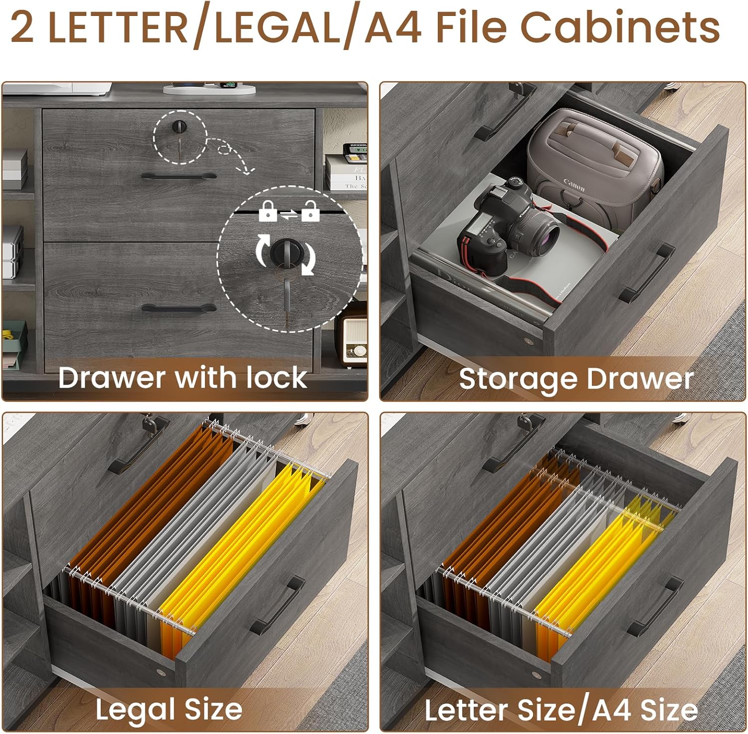 - 📁【What can you get?】 The file cabinet has 2 file drawers with 1 lock for Legal, Letter, A4 sizes standard file, power strip for charging 4 devices at the same time, spacious desktop large enough for printers and scanners, 6 storage shelves, 4 hooks and 4 industrial casters. Filing cabinet that can be combined with any computer desk to form an L-shaped office area.