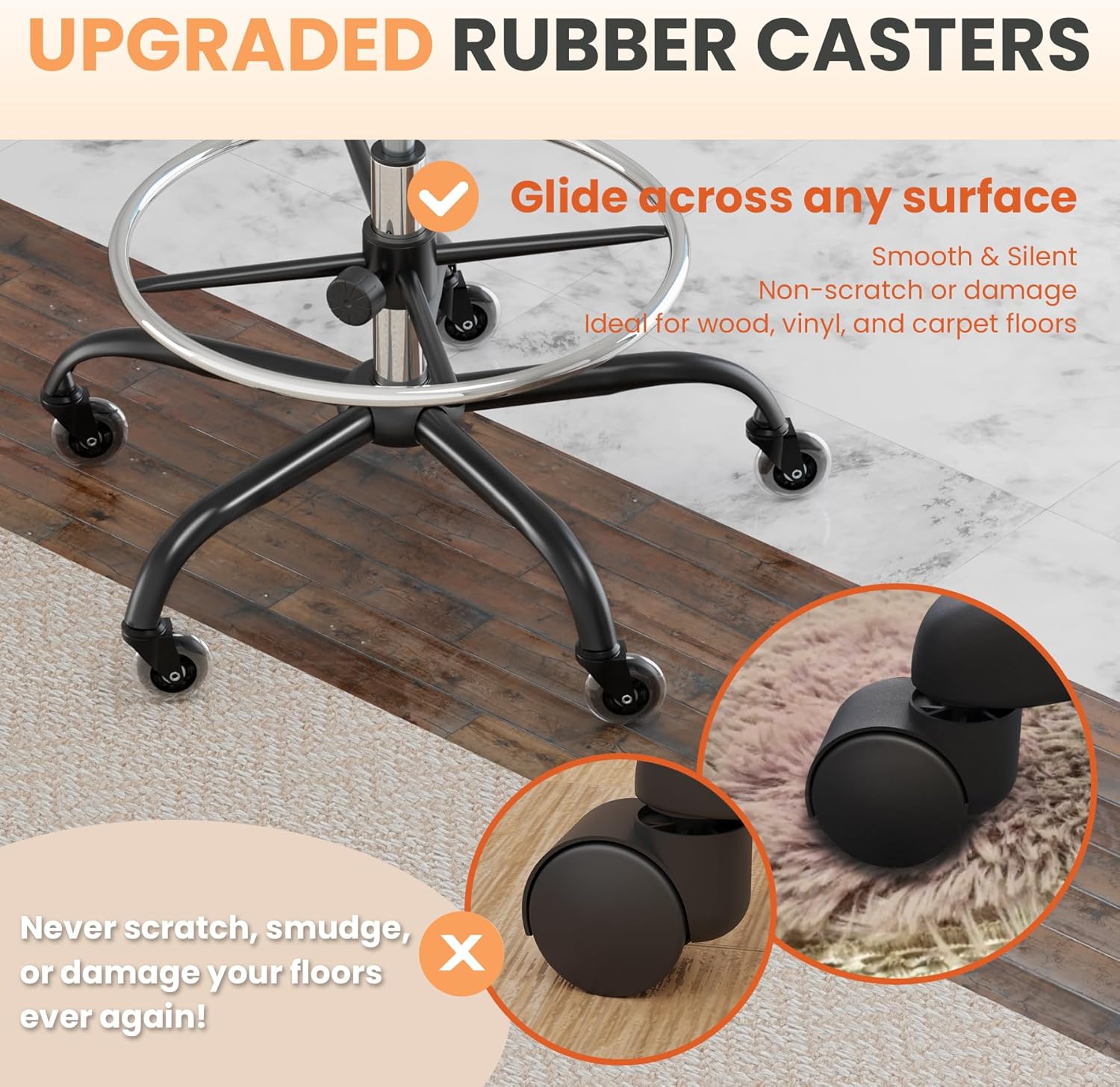 - UPGRADED RUBBER WHEELS: To accommodate different users needs, our high office chairs choose expensive but high quality rubber wheels. These rubber casters are friendly to any types of floors, and never scratch, damage or smudge your wood, vinyl, or carpet floors. We believe a better office chair is designed for users convenience in every aspects.